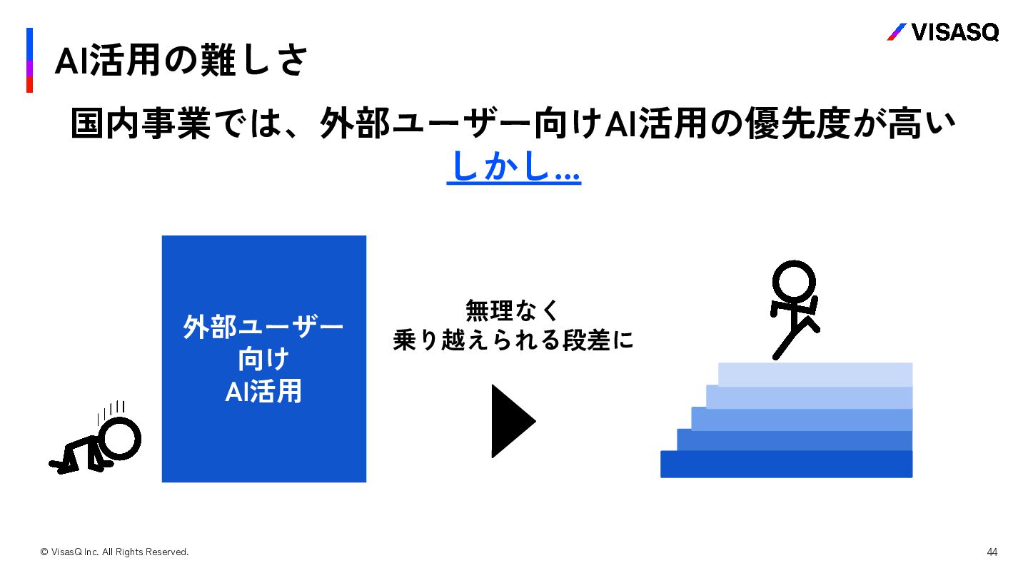 AI活用 国内事業では、外部ユーザー向けAI活用の優先度が高い しかし... 無理なく 乗り越えられる段差に