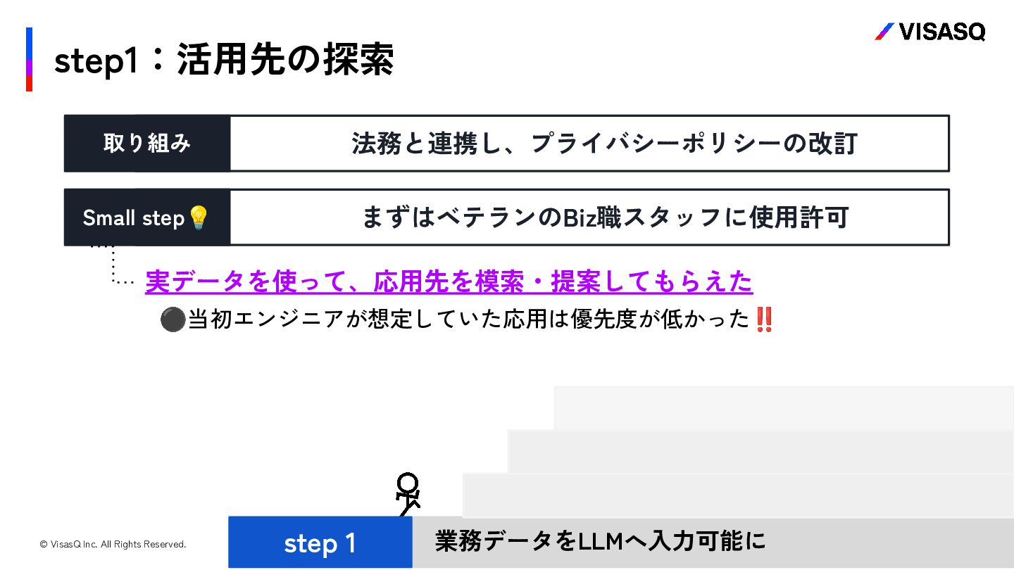 まずはベテランのBiz職スタッフに使用許可 Small step💡 実データを使って、応用先を模索・提案してもらえた ⚫当初エンジニアが想定していた応用は優先度が低かった‼ step 1 業務データをLLMへ入力可能に