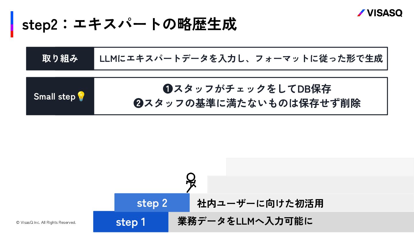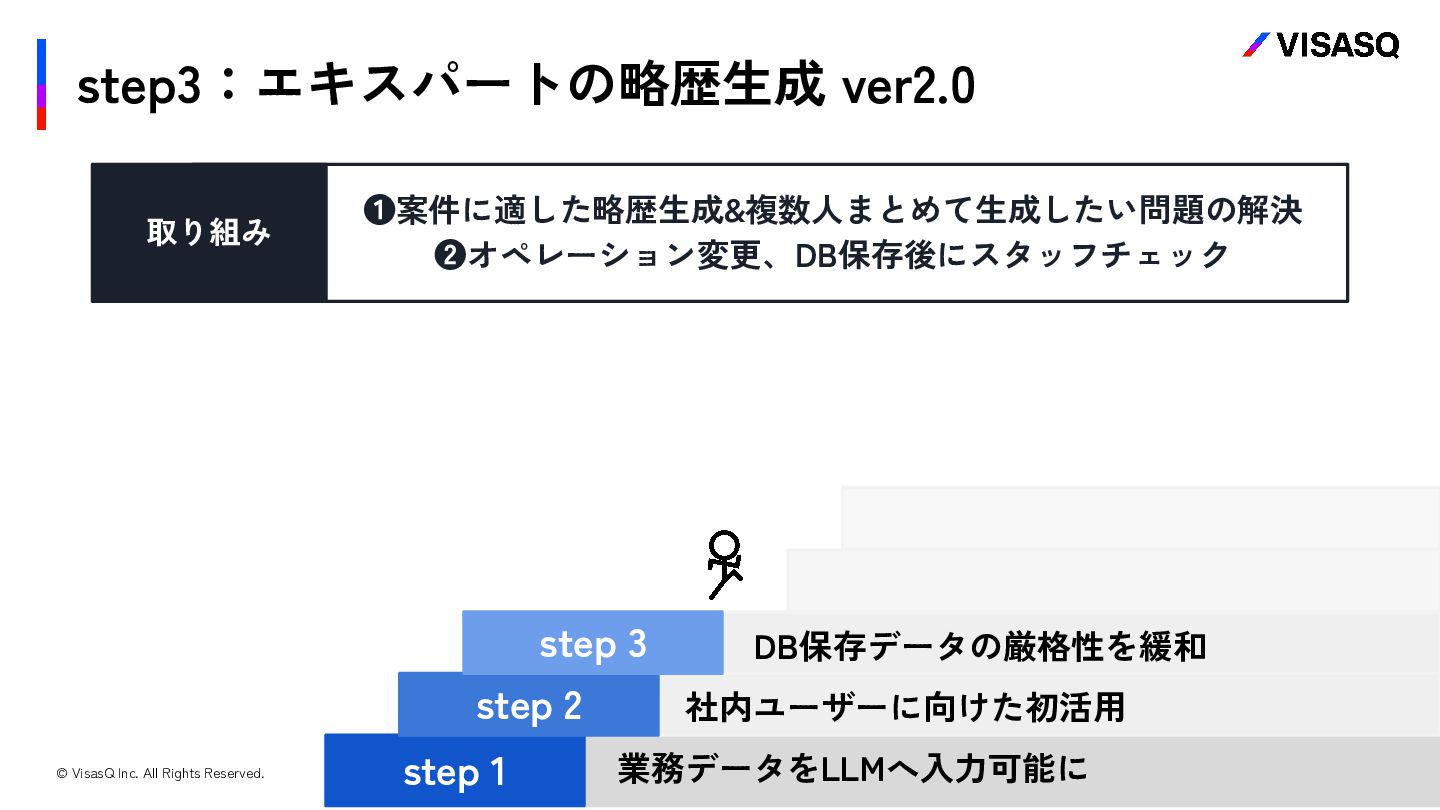 49 © VisasQ Inc. All Rights Reserved. step2:エキスパートの略歴生成 LLMにエキスパートデータを入力し、フォーマットに従った形で生成 取り組み