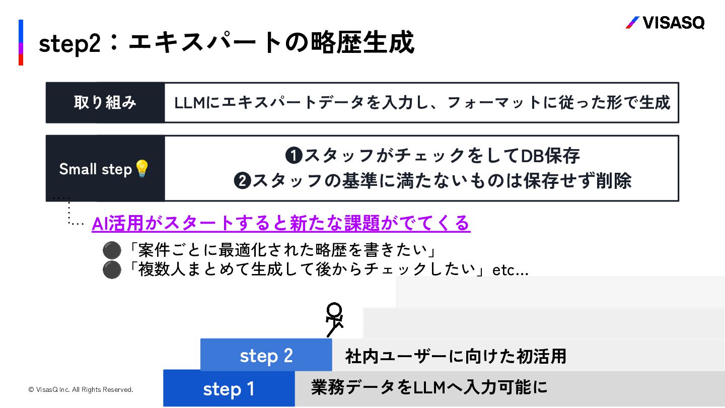 ❶スタッフがチェックをしてDB保存 ❷スタッフの基準に満たないものは保存せず削除 Small step💡 step 1 step 2 AI活用がスタートすると新たな課題がでてくる ⚫「案件ごとに最適化された略歴を書きたい」 ⚫「複数人まとめて生成して後からチェックしたい」etc… 業務データをLLMへ入力可能に 社内ユーザーに向けた初活用