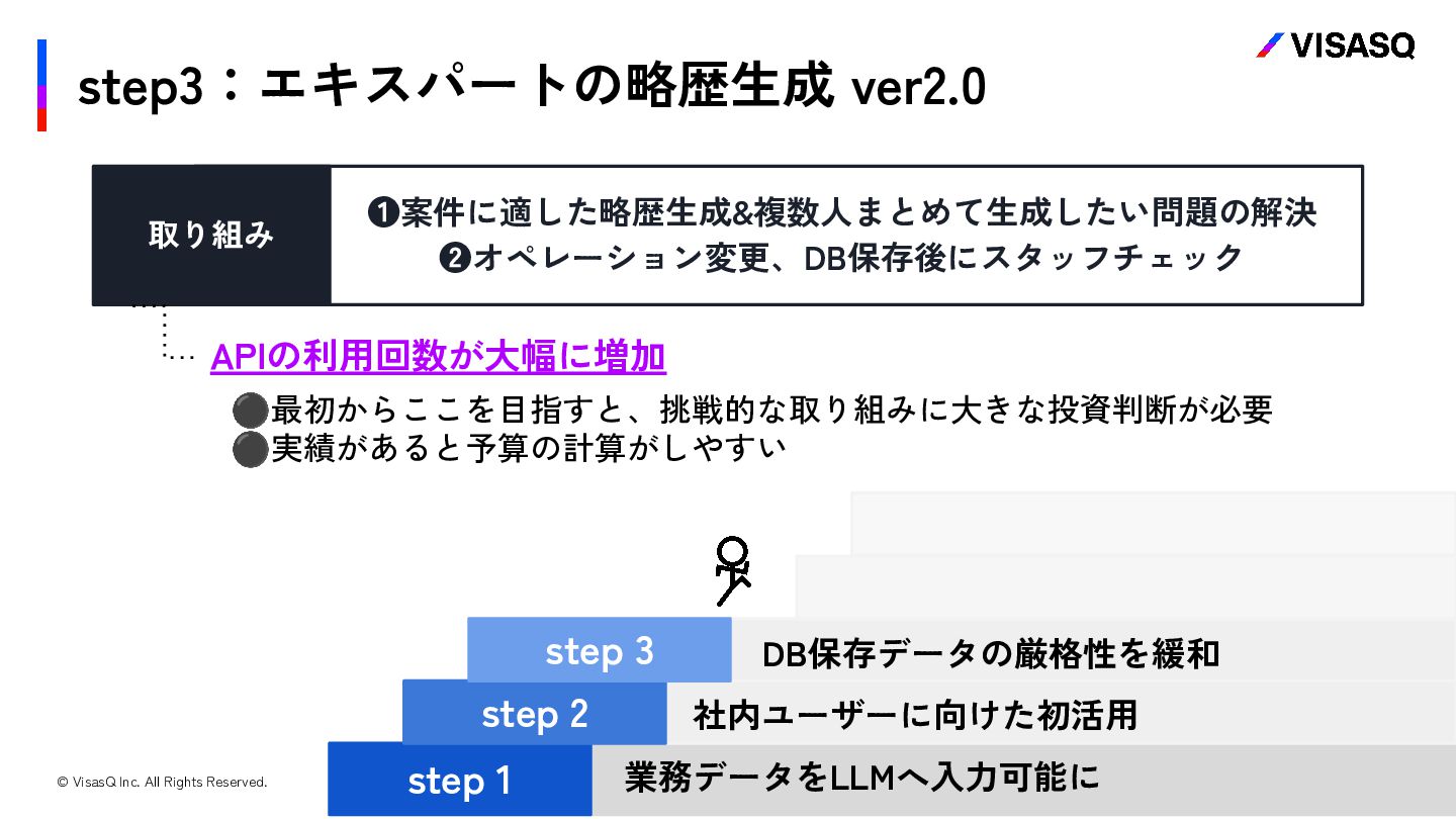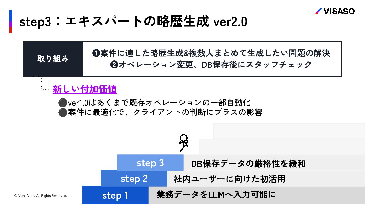 50 © VisasQ Inc. All Rights Reserved. step3:エキスパートの略歴生成 ver2.0 ❶案件に適した略歴生成&複数人まとめて生成したい問題の解決