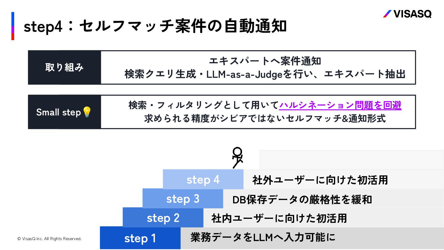 取り組み 検索・フィルタリングとして用いてハルシネーション問題を回避 求められる精度がシビアではないセルフマッチ&通知形式 Small step💡 step 1 step 1 step 2 step 3 step 4 業務データをLLMへ入力可能に 社内ユーザーに向けた初活用 DB保存データの厳格性を緩和 社外ユーザーに向けた初活用