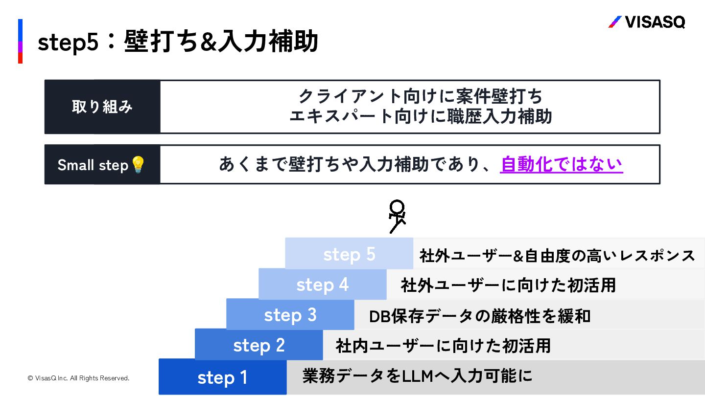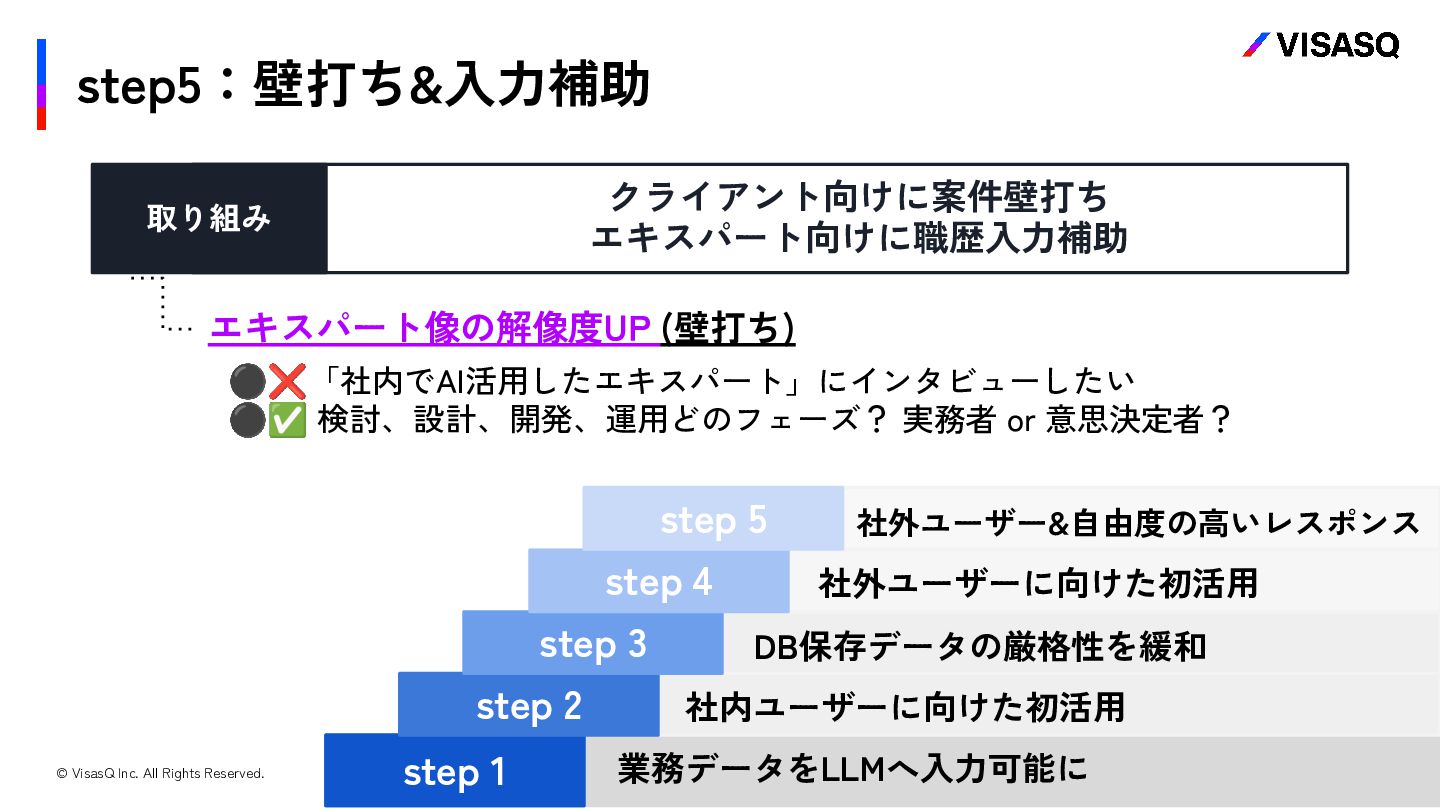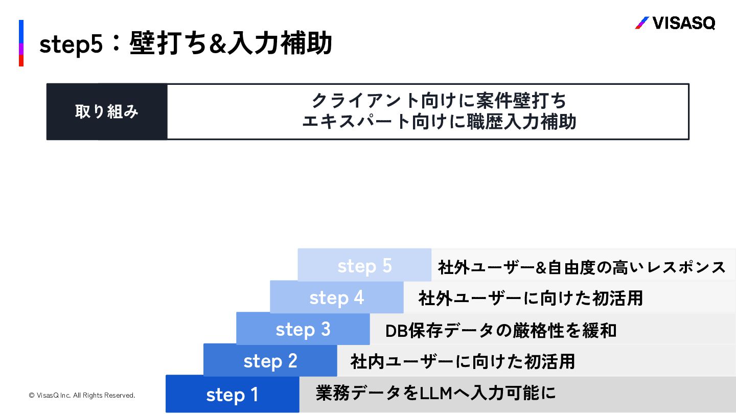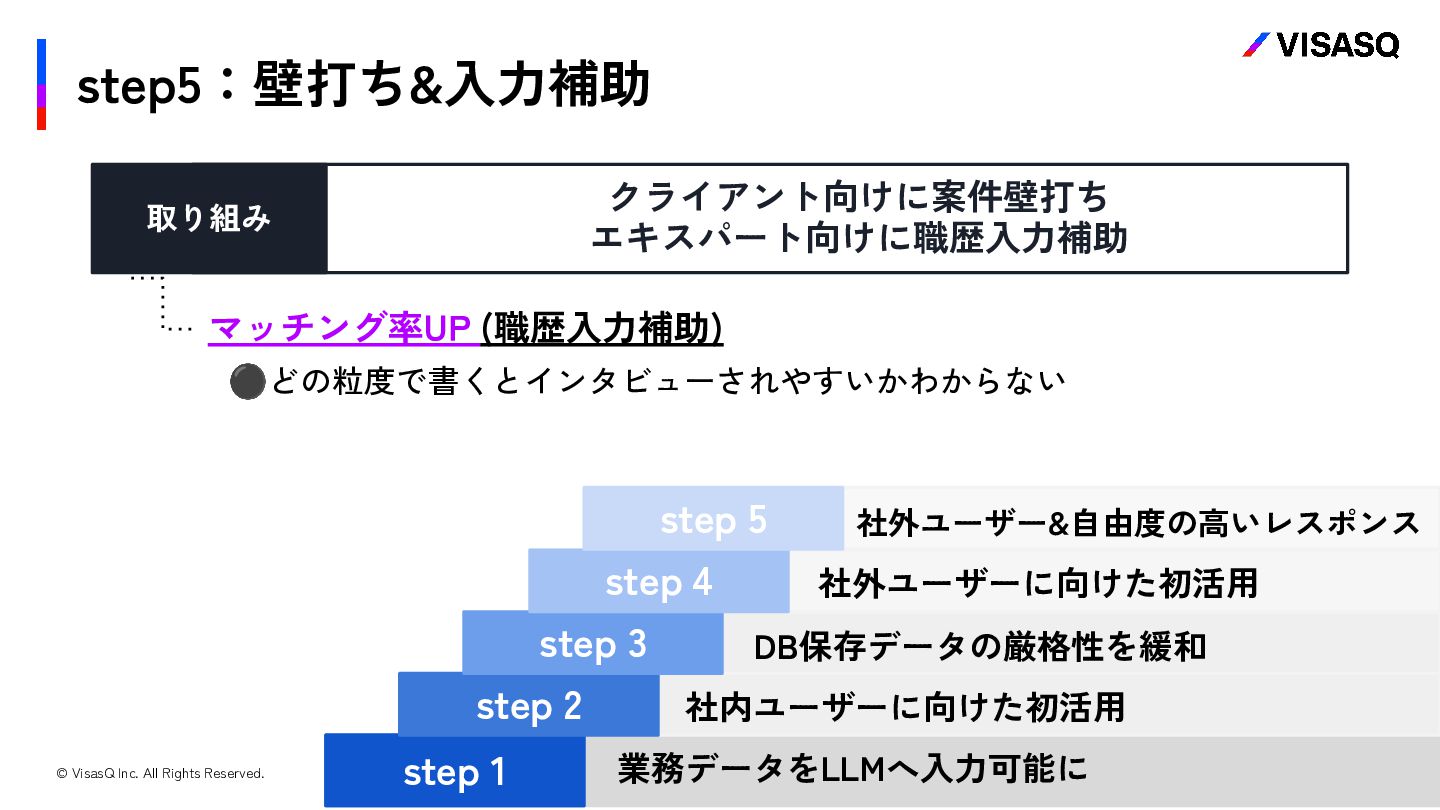 取り組み step 1 step 1 step 2 社内ユーザーに向けた初活用 step 3 DB保存データの厳格性を緩和 step 4 社外ユーザーに向けた初活用 step 5 社外ユーザー&自由度の高いレスポンス 業務データをLLMへ入力可能に マッチング率UP (職歴入力補助) ⚫どの粒度で書くとインタビューされやすいかわからない