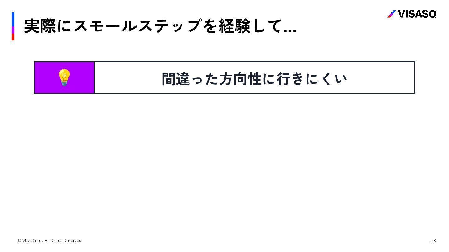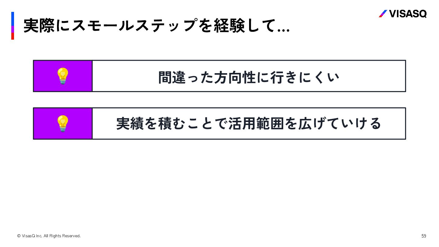 58 © VisasQ Inc. All Rights Reserved. 実際にスモールステップを経験して… 間違った方向性に行きにくい 💡