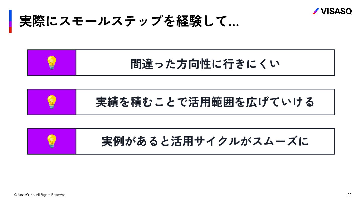 59 © VisasQ Inc. All Rights Reserved. 実際にスモールステップを経験して… 間違った方向性に行きにくい 💡