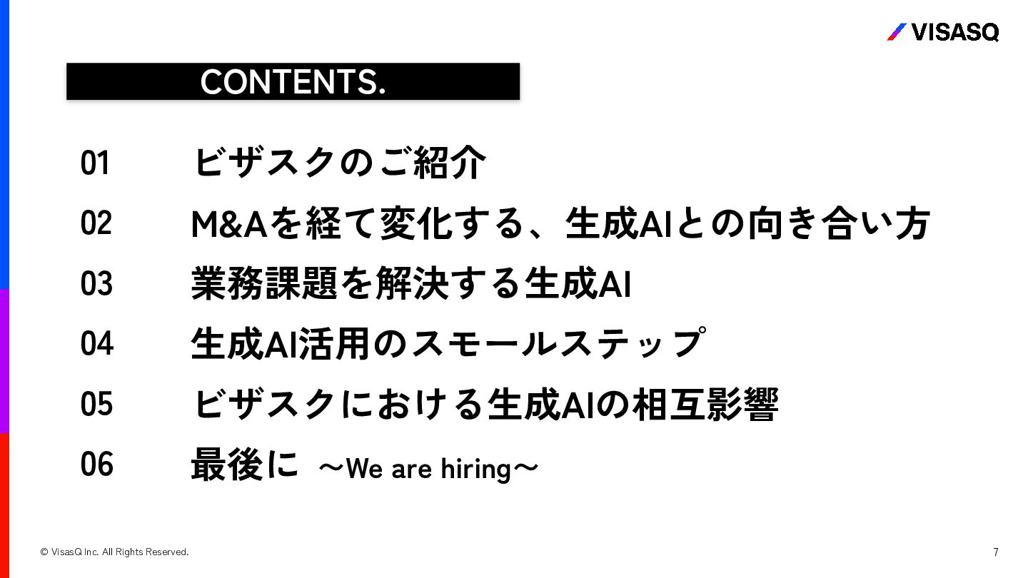 M&Aを経て変化する、生成AIとの向き合い方 CONTENTS. 03 業務課題を解決する生成AI 04 生成AI活用のスモールステップ 05 ビザスクにおける生成AIの相互影響 06 最後に 〜We are hiring〜