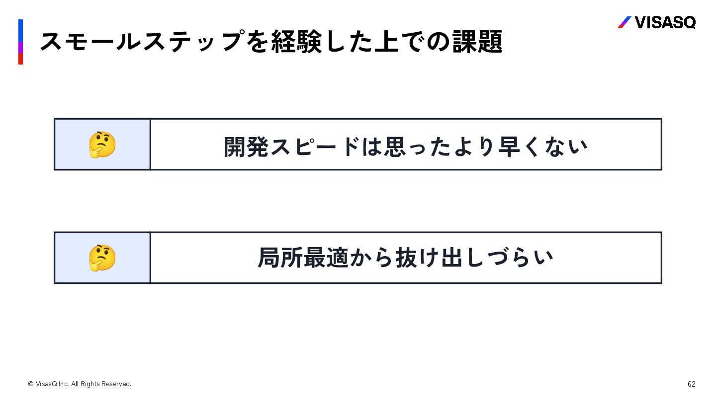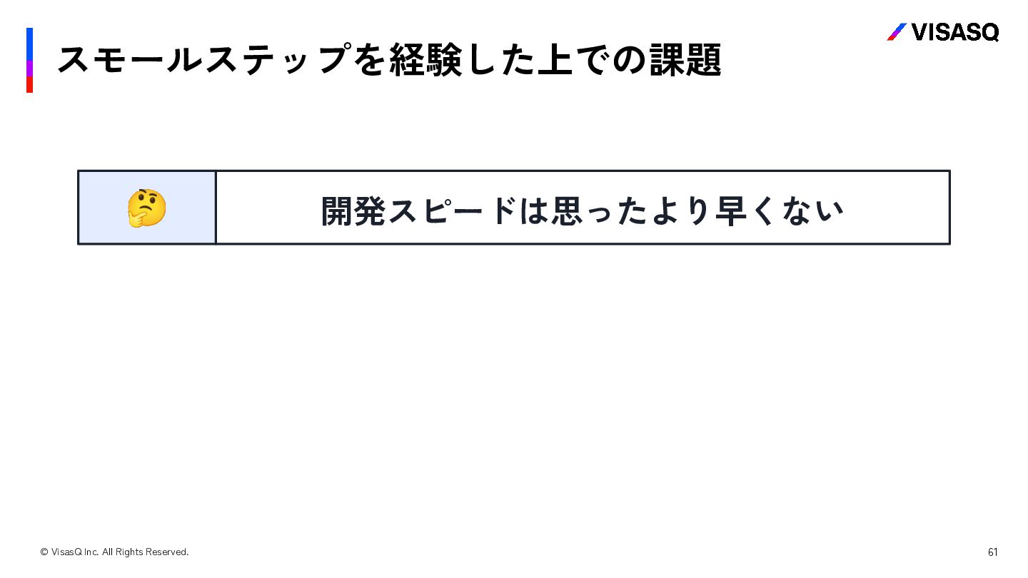 61 © VisasQ Inc. All Rights Reserved. スモールステップを経験した上での課題 開発スピードは思ったより早くない 🤔