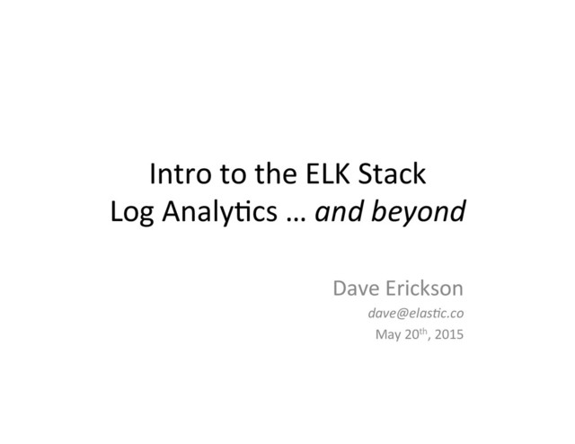 & Shield 2.0 • Watcher (Aler4ng for Elas4csearch) • Logstash – Cleaner Plugins – Bemer Windows Support – More inputs (Ka•a, Avro ... etc.) – Buffering, Clustering, Resiliency • Elas4csearch – Aggrega4ons 2.0 (name pending) – Changes API, Re-‐indexing API • Elas4csearch Hadoop Connector – Na4ve support for Spark, Storm, Yarn – Exposing ES internals to Machine Learning • Kibana – Rapidly evolving