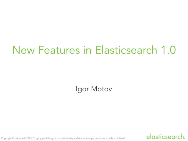 is strictly prohibited about • Developer at Elasticsearch Inc joined Elasticsearch Inc.: Oct 2012 Elasticsearch contributor since Apr 2011 ! • Elasticsearch Inc founded: July 2012 headquarters: Amsterdam and Los Altos, CA provides: training (public & onsite), development support, production support subscription