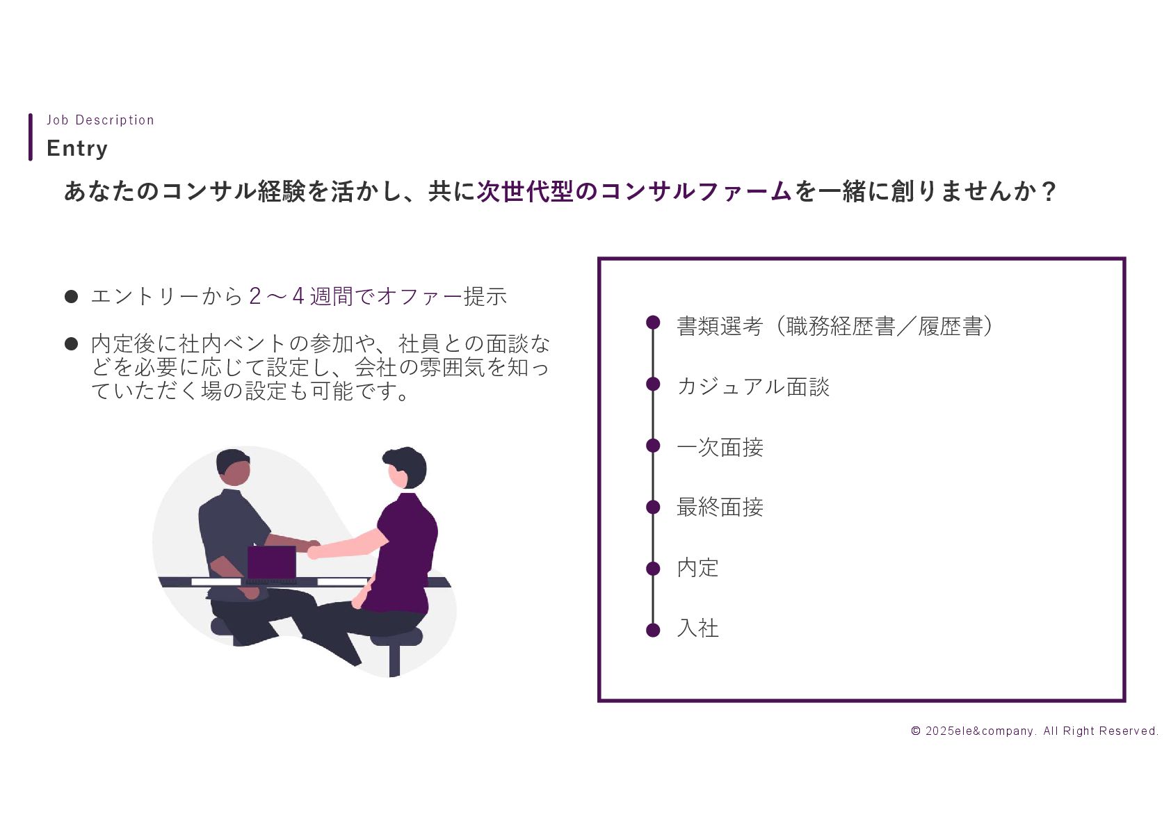 Manager Director Partner 700~1,100 550~700 1,100~1,500 1,500~1,800 1,800~2,500 2,000~ 年収目安(単位:万円) 役割 チームリーダーとして、プロジェクトの進行管理や クライアントとの折衝を担当 プロジェクトメンバーとして、情報収集や分析を行い、 プロジェクトの実作業を担当 チーム責任者として、日々の進捗・品質管理や メンバー育成、成果物の最終レビューを担当 クライアント課題解決のリードとして、新規提案の推進と プロジェクト全体管理を担当 事業規模の大きな顧客案件の統括責任者として、 複数プロジェクトの成功と収益最大化を担当 アドバイザーとして、経営や営業面での意思決定を含む 企業全体の成⾧戦略提案と案件の最終責任を担当 © 2025ele&company. All Right Reserved.