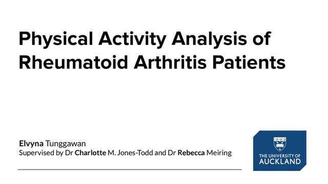 Autoimmune disorder, symmetrical nature [2, 3] • Limited physical activity, leads to frustration & higher risk of having heart disease [1, 4] Research Problem • Any changes in the activities after RA patients got drugs treatment? • Does spending more time in particular activity affect their health? [1] Ahlstrand, I., Björk, M., Thyberg, I., Börsbo, B., and Falkmer, T. (2012). Pain and daily activities in rheumatoid arthritis. Disability and Rehabilitation, 34(15):1245–1253. [2] Bullock, J., Rizvi, S. A., Saleh, A. M., Ahmed, S. S., Do, D. P., Ansari, R. A., and Ahmed, J. (2018). Rheumatoid Arthritis: A Brief Overview of the Treatment. Medical Principles and Practice, 27(6):501–507. [3] Dewing, K. A., Setter, S. M., and Slusher, B. A. (2012). Osteoarthritis and Rheumatoid Arthritis 2012: Pathophysiology, Diagnosis, and Treatment. Clinical Advisor. [4] Fenton, S. A., van Zanten, J. J. V., Duda, J. L., Metsios, G. S., and Kitas, G. D. (2018). Sedentary behaviour in rheumatoid arthritis: definition, measurement and implications for health. Rheumatology, 57(2):213–226. [5] Posalski, J., & Weisman, M. (2009). Articular and Periarticular Manifestations of Established Rheumatoid Arthritis. In Rheumatoid Arthritis, chapter 5A, pages 49-61, Mosby, Philadelphia, USA.