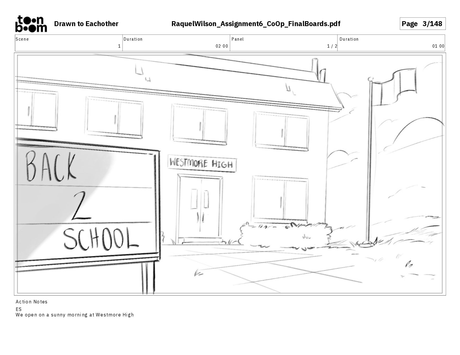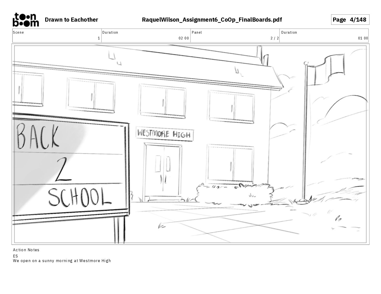 01 00 Action Notes ES We open on a sunny morning at Westmore High Drawn to Eachother RaquelWilson_Assignment6_CoOp_FinalBoards.pdf Page 4/148