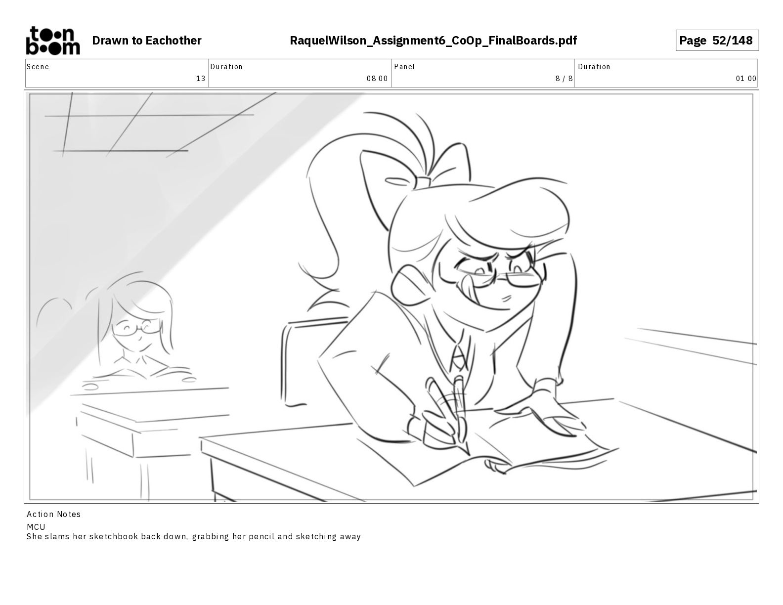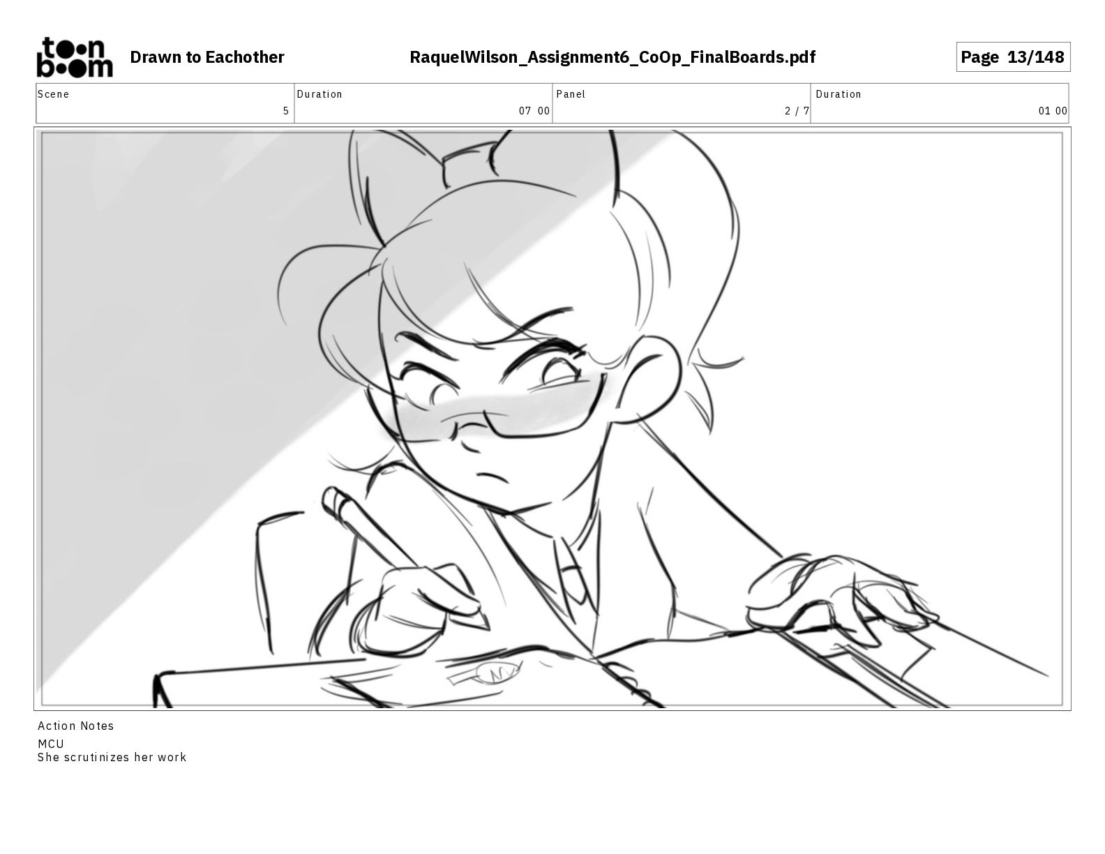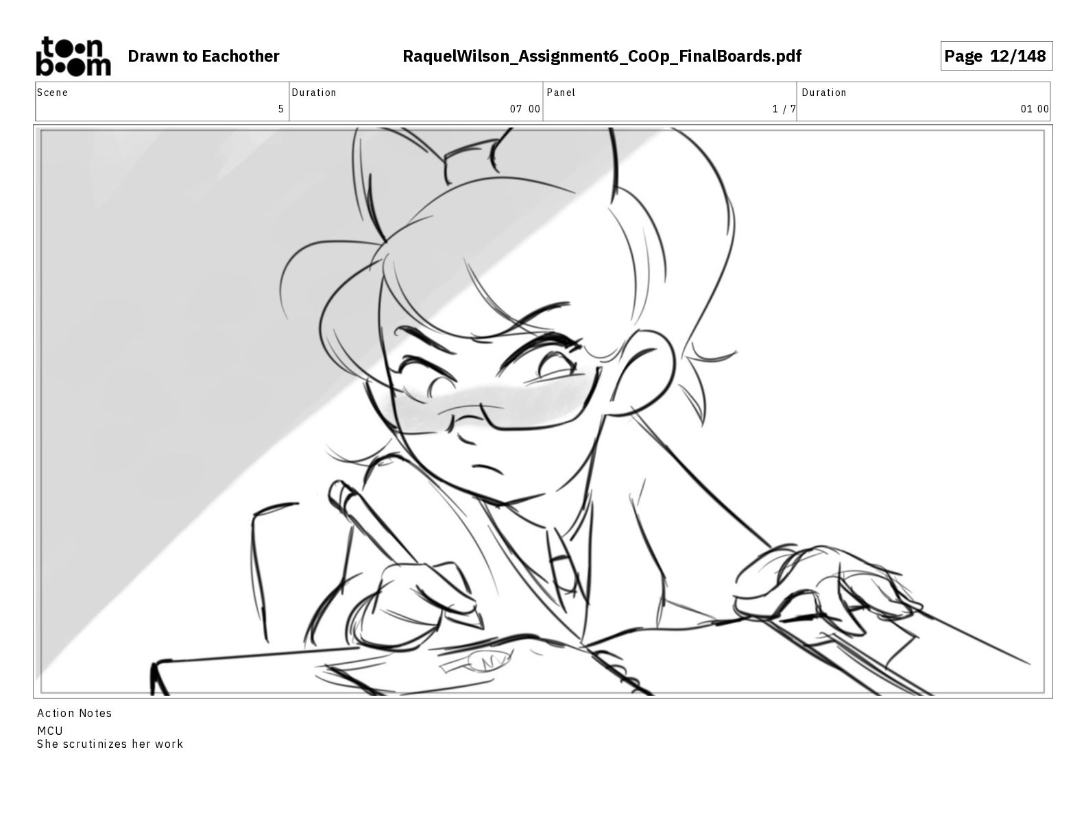 01 00 Action Notes MCU She scrutinizes her work Drawn to Eachother RaquelWilson_Assignment6_CoOp_FinalBoards.pdf Page 12/148