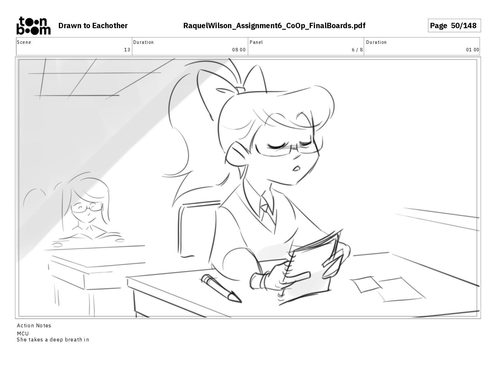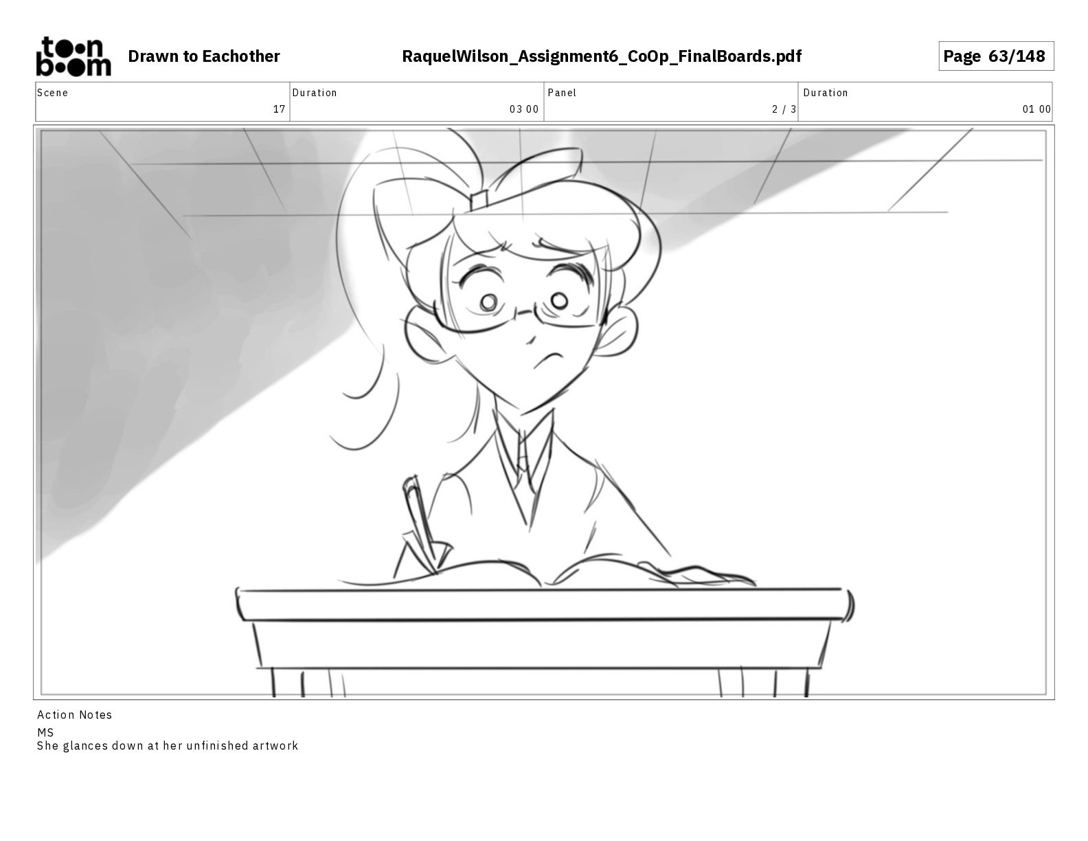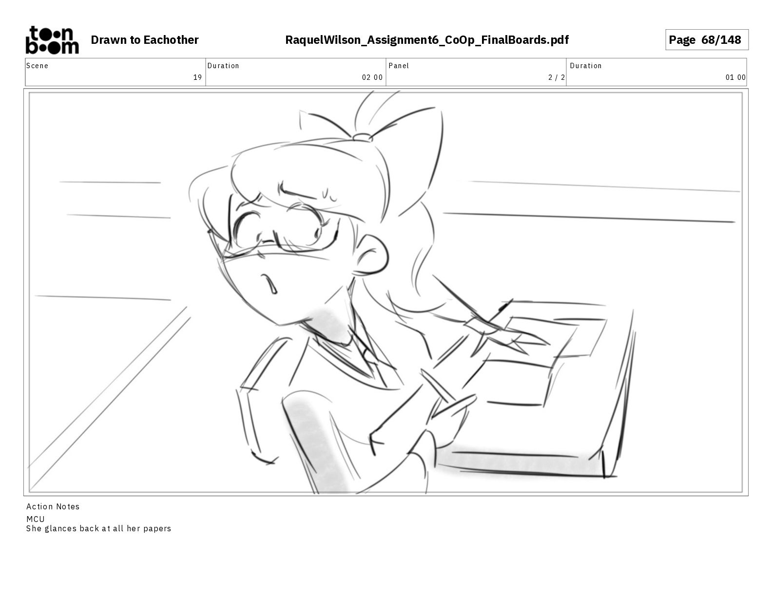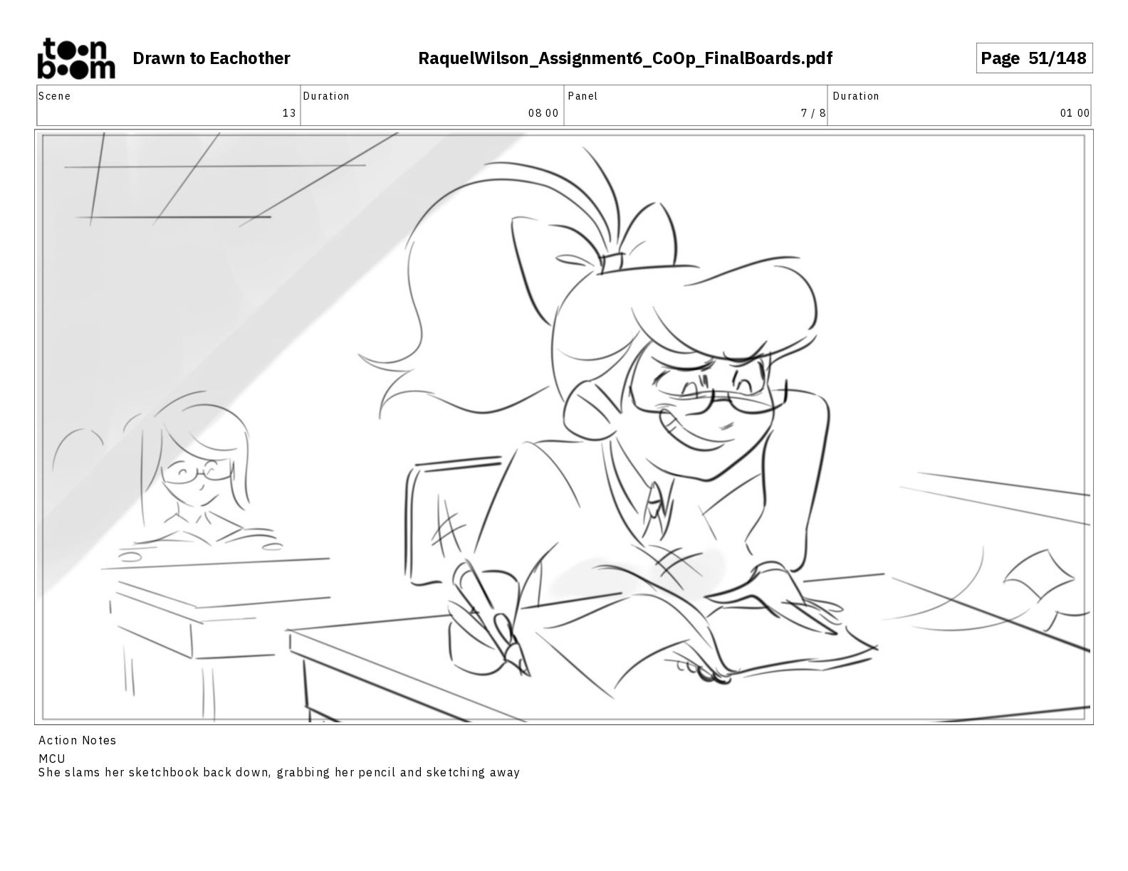 01 00 Action Notes MCU She scrutinizes her work Drawn to Eachother RaquelWilson_Assignment6_CoOp_FinalBoards.pdf Page 12/148