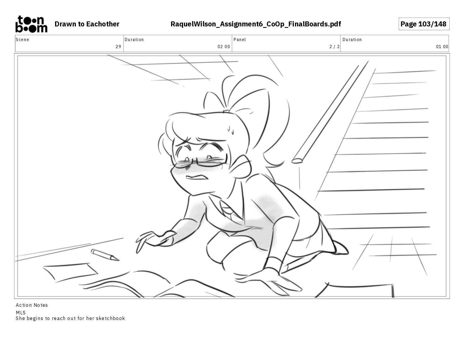 01 00 Action Notes MLS She begins to reach out for her sketchbook Drawn to Eachother RaquelWilson_Assignment6_CoOp_FinalBoards.pdf Page 103/148