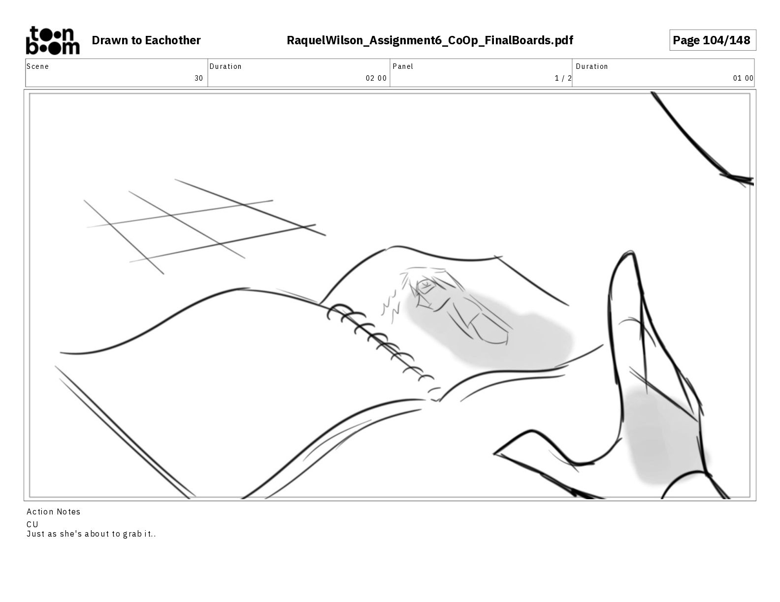 01 00 Action Notes CU Just as she's about to grab it.. Drawn to Eachother RaquelWilson_Assignment6_CoOp_FinalBoards.pdf Page 104/148
