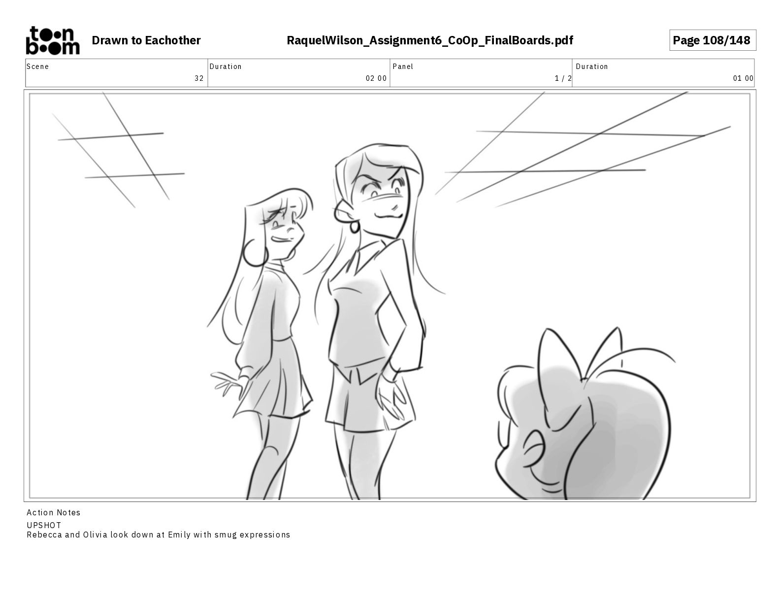 01 00 Action Notes UPSHOT Rebecca and Olivia look down at Emily with smug expressions Drawn to Eachother RaquelWilson_Assignment6_CoOp_FinalBoards.pdf Page 108/148