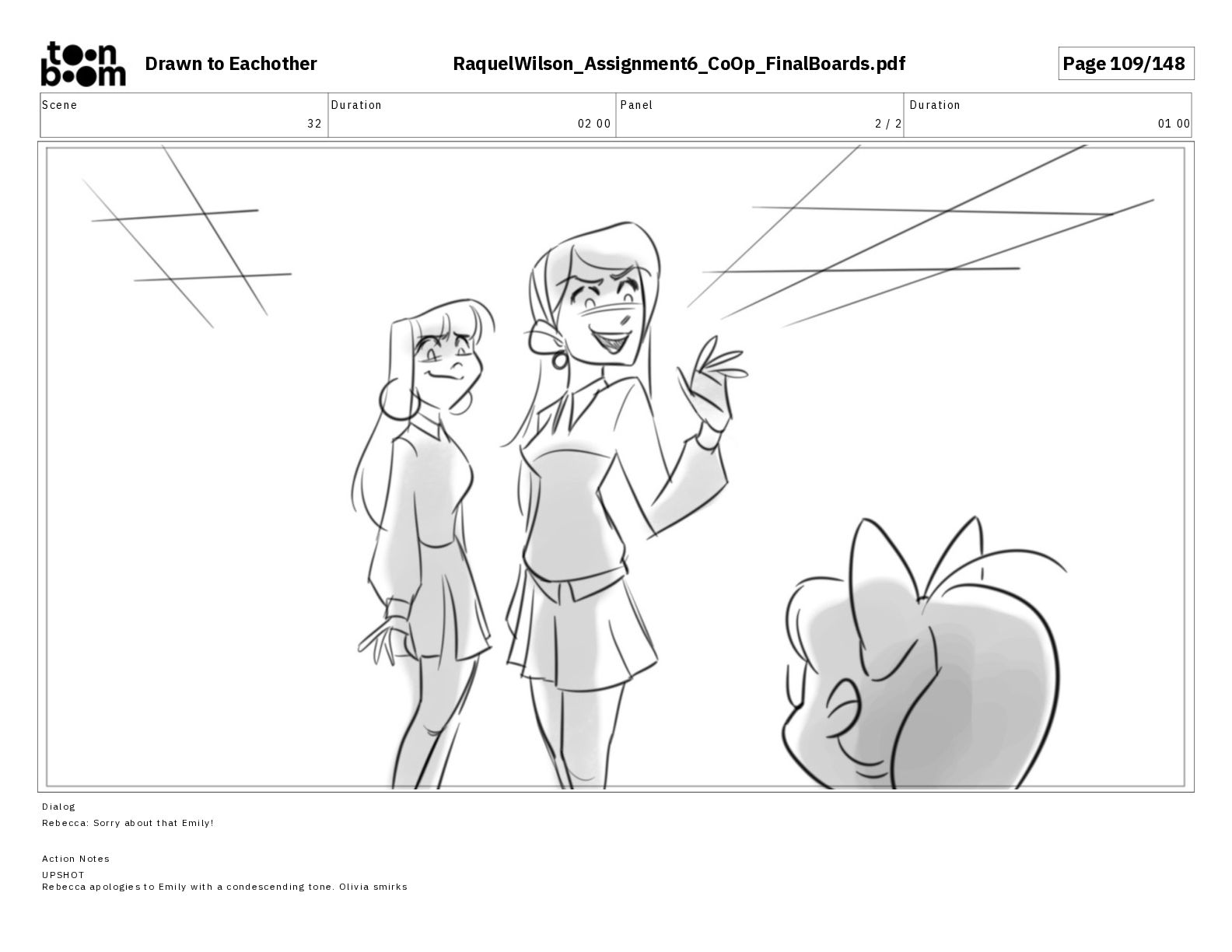 01 00 Dialog Rebecca: Sorry about that Emily! Action Notes UPSHOT Rebecca apologies to Emily with a condescending tone. Olivia smirks Drawn to Eachother RaquelWilson_Assignment6_CoOp_FinalBoards.pdf Page 109/148