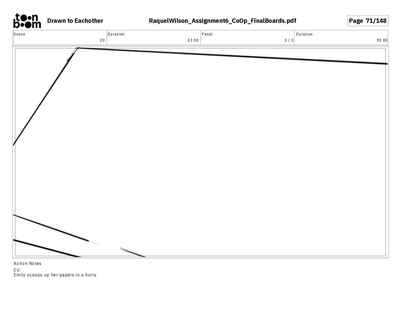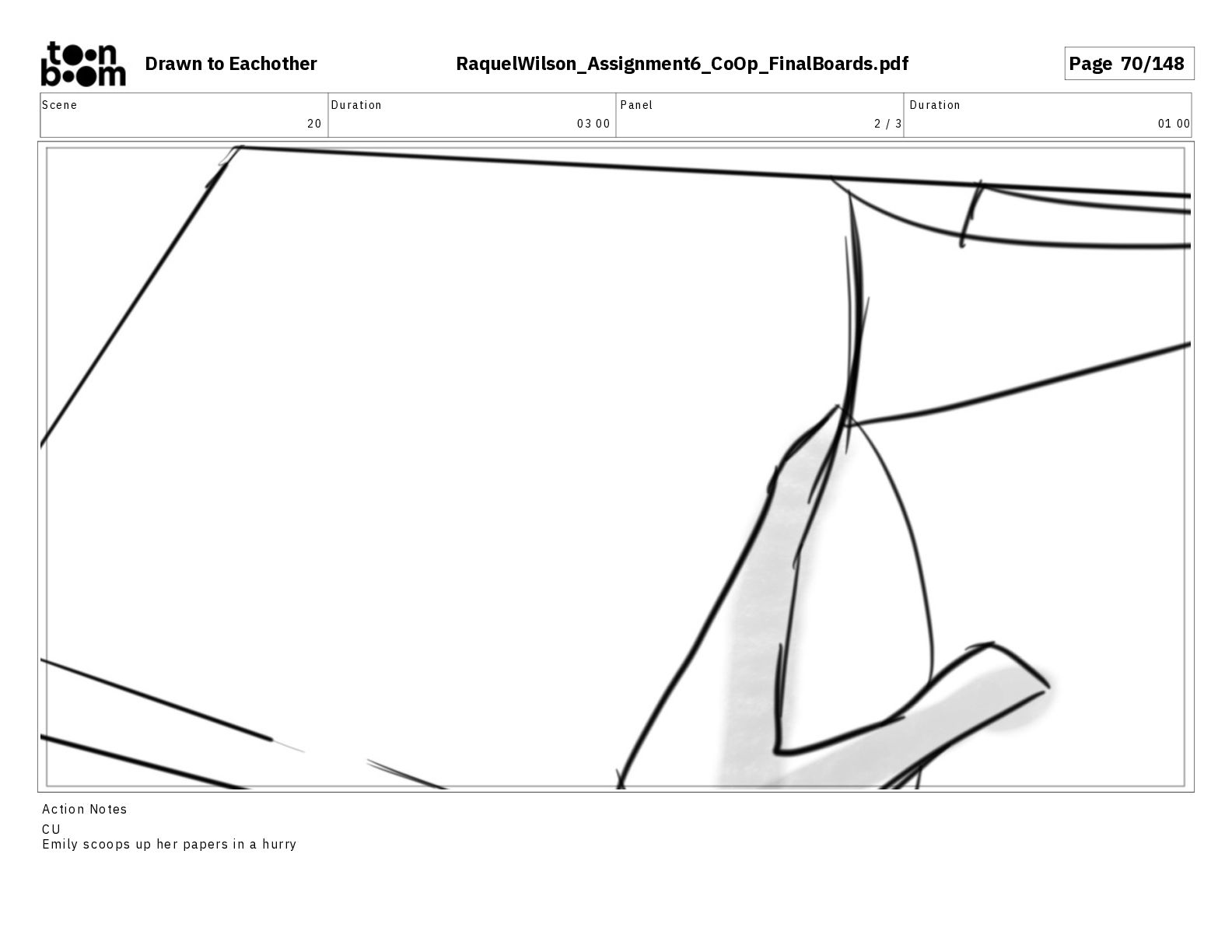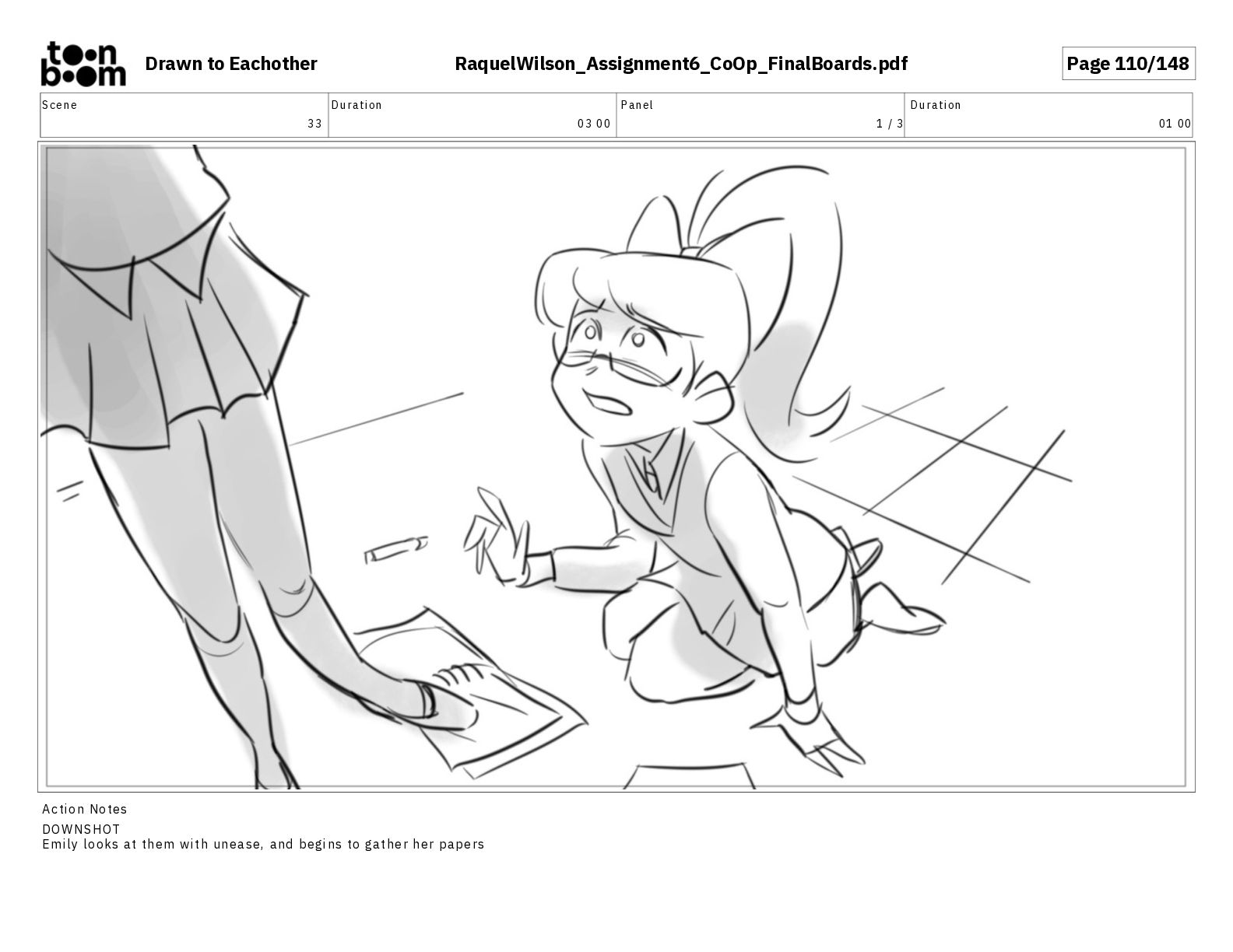 01 00 Action Notes DOWNSHOT Emily looks at them with unease, and begins to gather her papers Drawn to Eachother RaquelWilson_Assignment6_CoOp_FinalBoards.pdf Page 110/148
