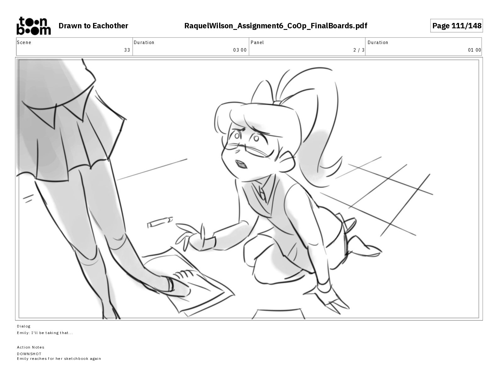 01 00 Dialog Emily: I'll be taking that... Action Notes DOWNSHOT Emily reaches for her sketchbook again Drawn to Eachother RaquelWilson_Assignment6_CoOp_FinalBoards.pdf Page 111/148
