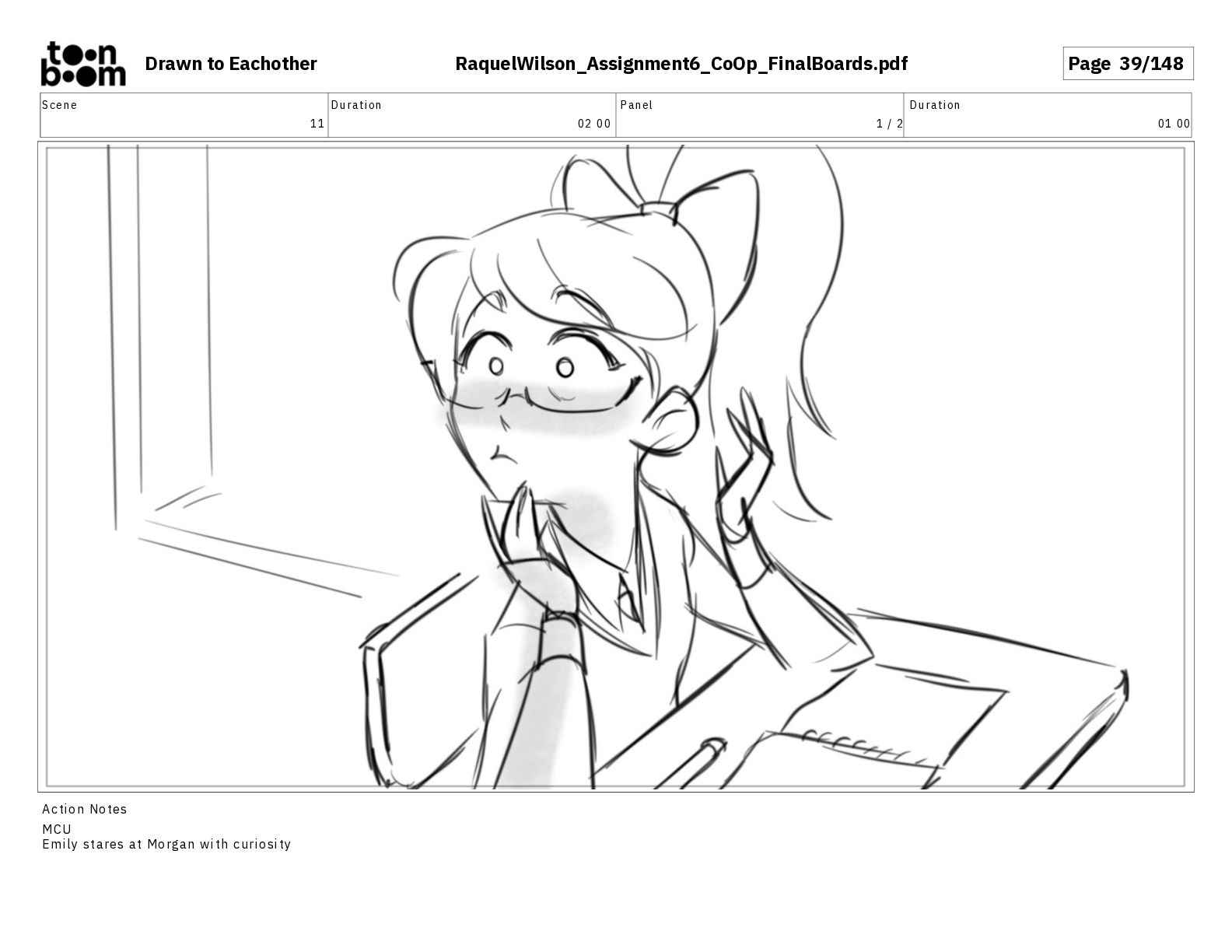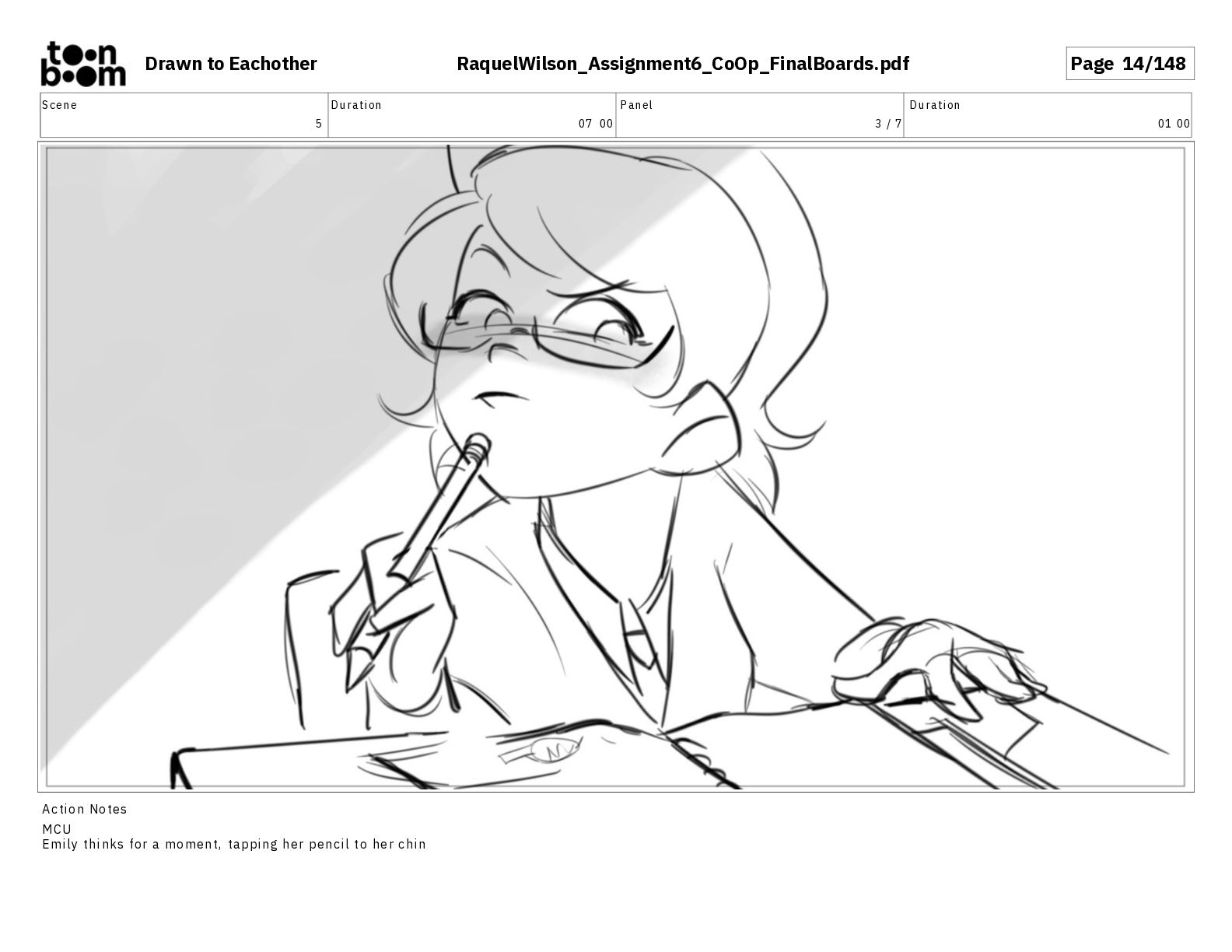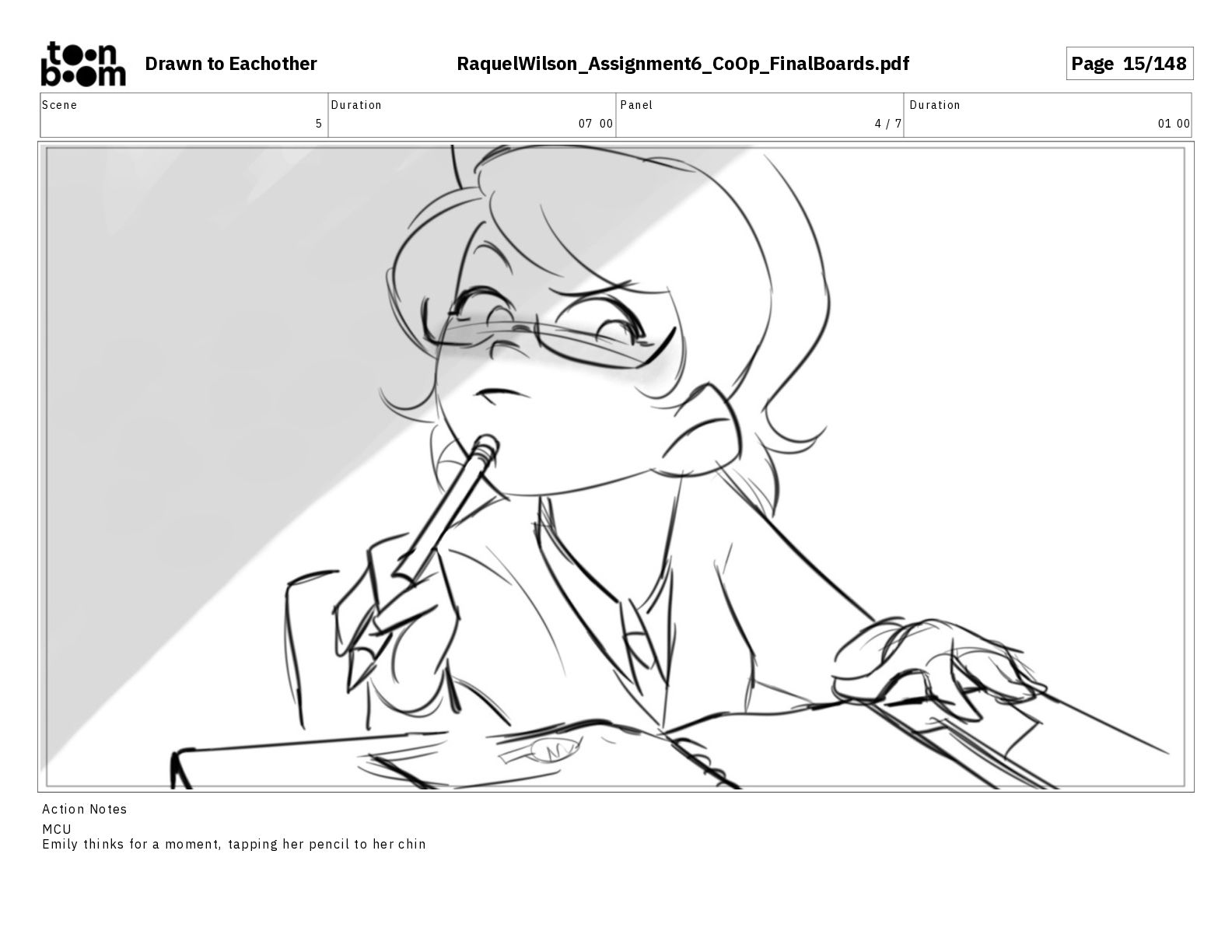 01 00 Action Notes MCU Emily thinks for a moment, tapping her pencil to her chin Drawn to Eachother RaquelWilson_Assignment6_CoOp_FinalBoards.pdf Page 15/148