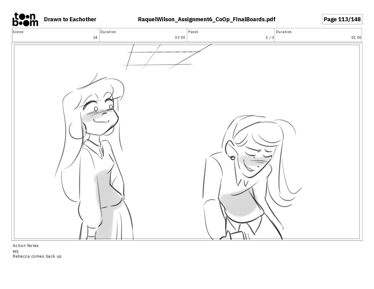 01 00 Action Notes MS Rebecca comes back up Drawn to Eachother RaquelWilson_Assignment6_CoOp_FinalBoards.pdf Page 113/148