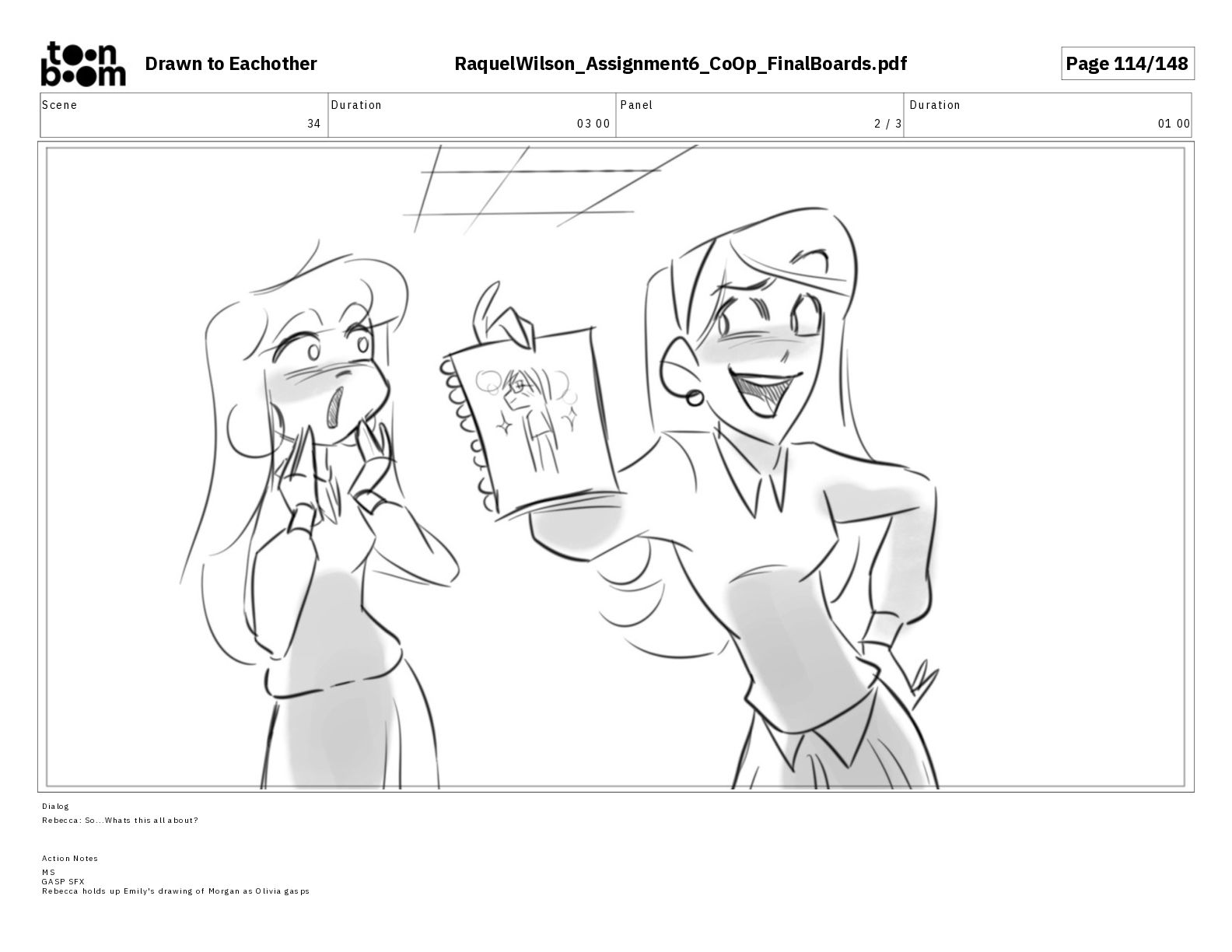 01 00 Dialog Rebecca: So...Whats this all about? Action Notes MS GASP SFX Rebecca holds up Emily's drawing of Morgan as Olivia gasps Drawn to Eachother RaquelWilson_Assignment6_CoOp_FinalBoards.pdf Page 114/148