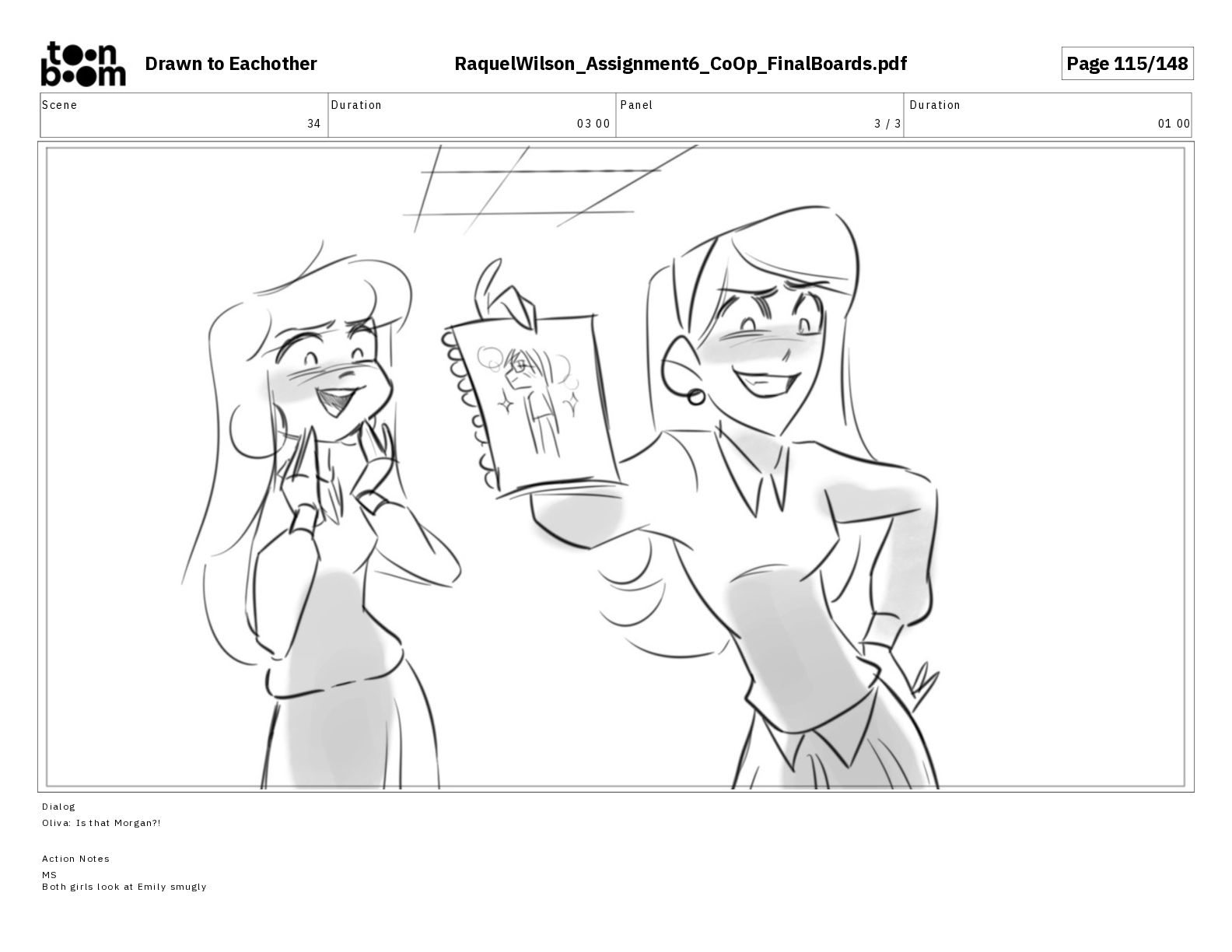 01 00 Dialog Oliva: Is that Morgan?! Action Notes MS Both girls look at Emily smugly Drawn to Eachother RaquelWilson_Assignment6_CoOp_FinalBoards.pdf Page 115/148