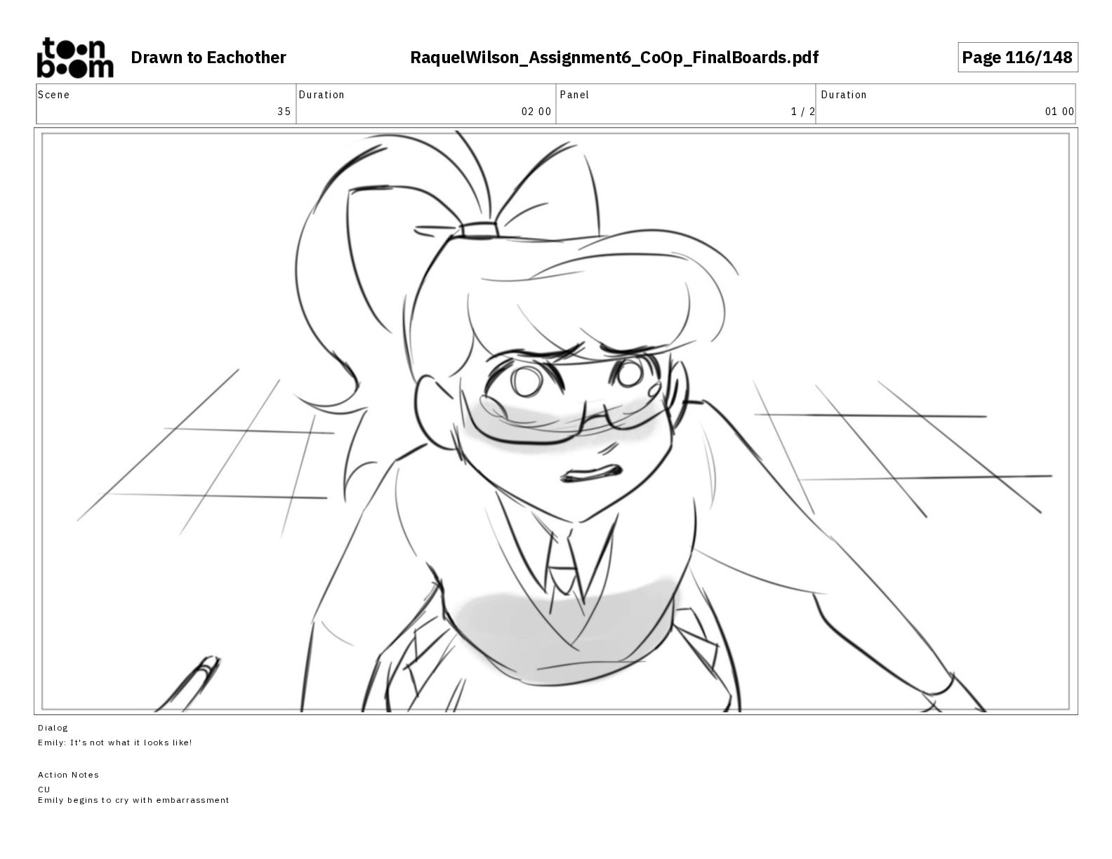 01 00 Dialog Emily: It's not what it looks like! Action Notes CU Emily begins to cry with embarrassment Drawn to Eachother RaquelWilson_Assignment6_CoOp_FinalBoards.pdf Page 116/148