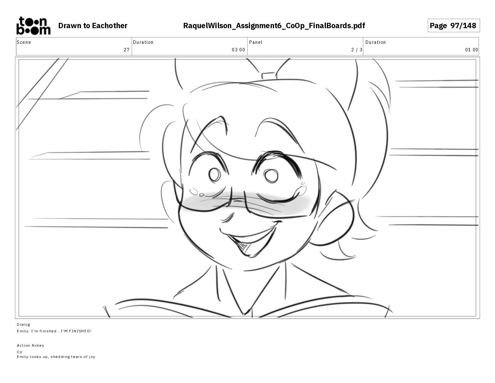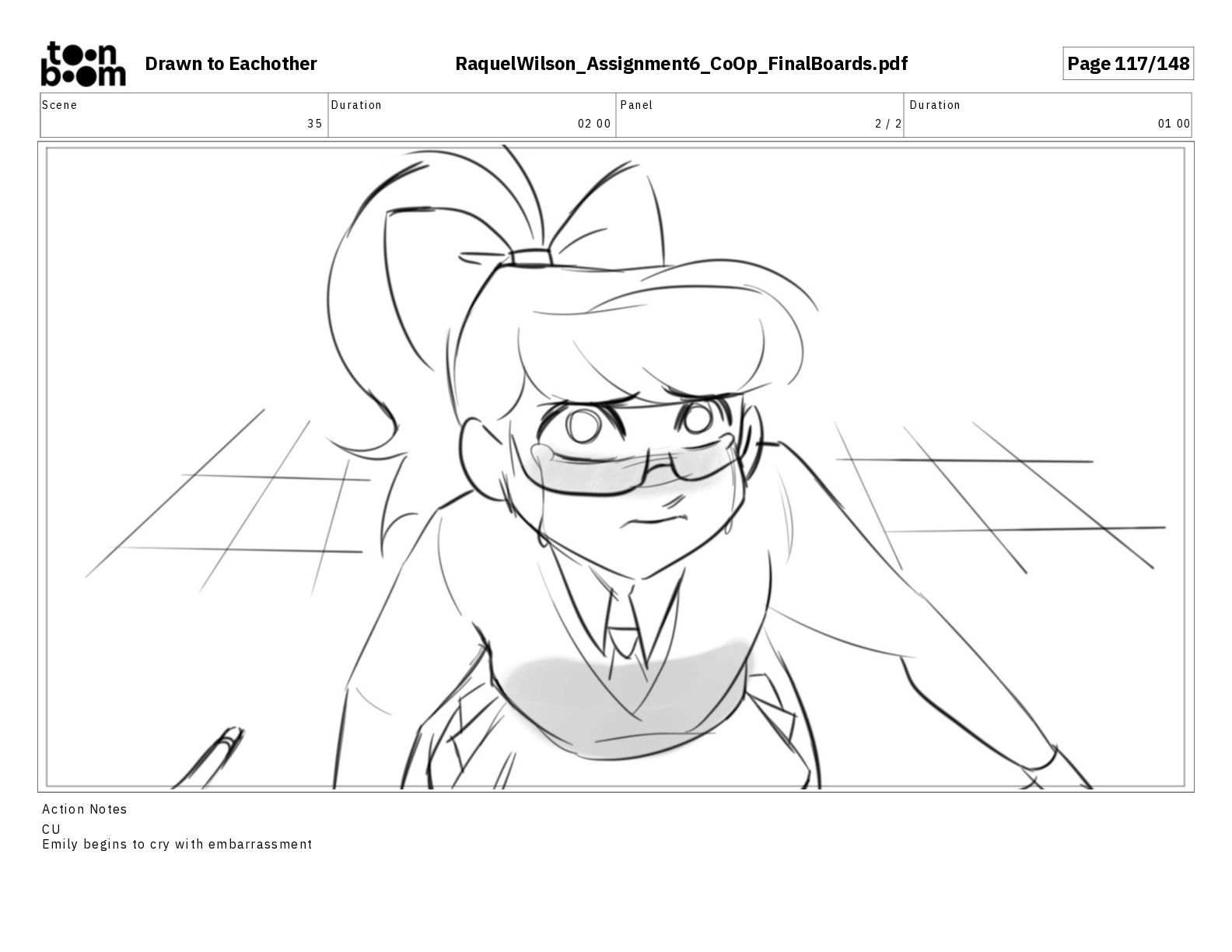 01 00 Action Notes CU Emily begins to cry with embarrassment Drawn to Eachother RaquelWilson_Assignment6_CoOp_FinalBoards.pdf Page 117/148
