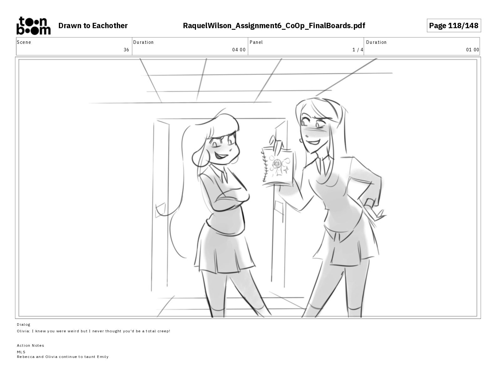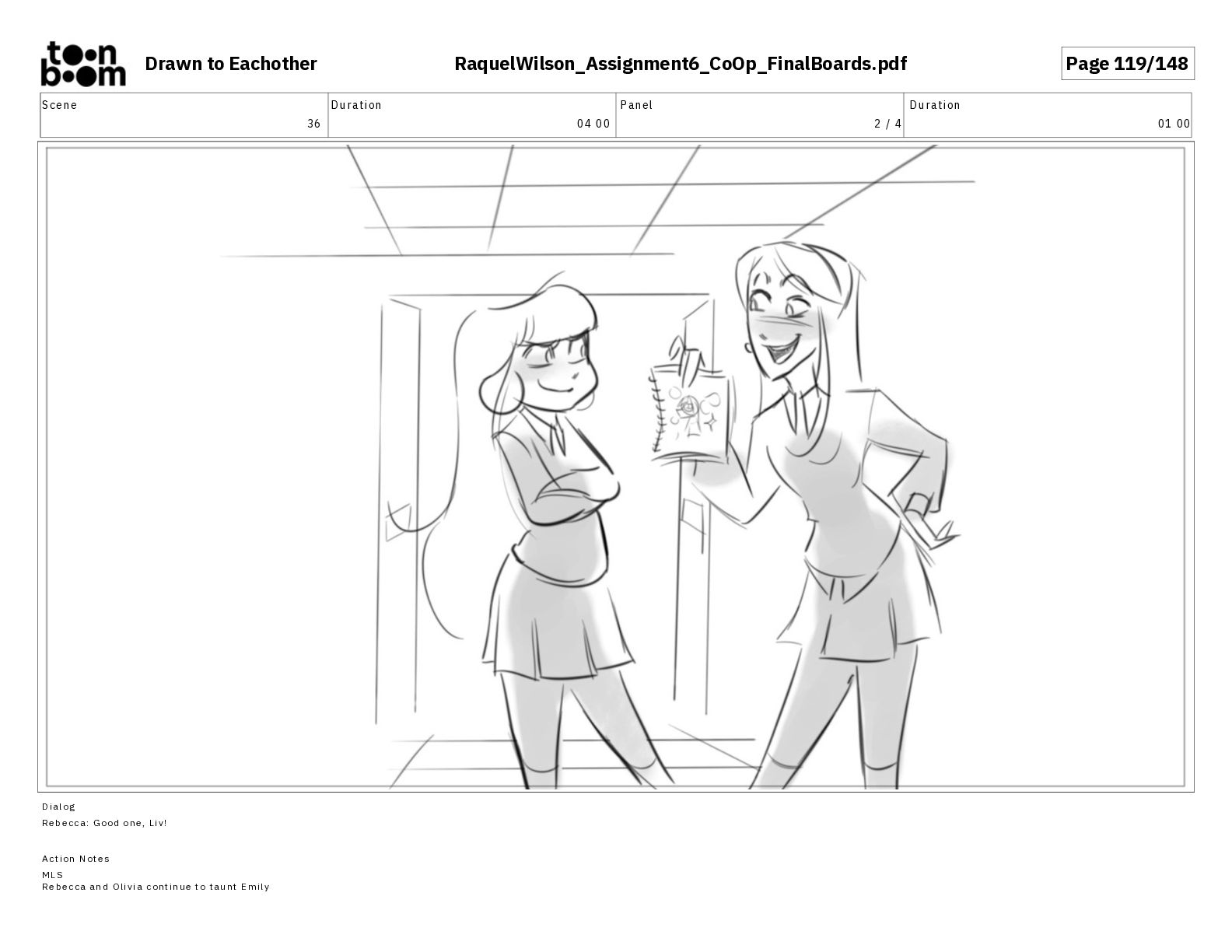 01 00 Dialog Rebecca: Good one, Liv! Action Notes MLS Rebecca and Olivia continue to taunt Emily Drawn to Eachother RaquelWilson_Assignment6_CoOp_FinalBoards.pdf Page 119/148