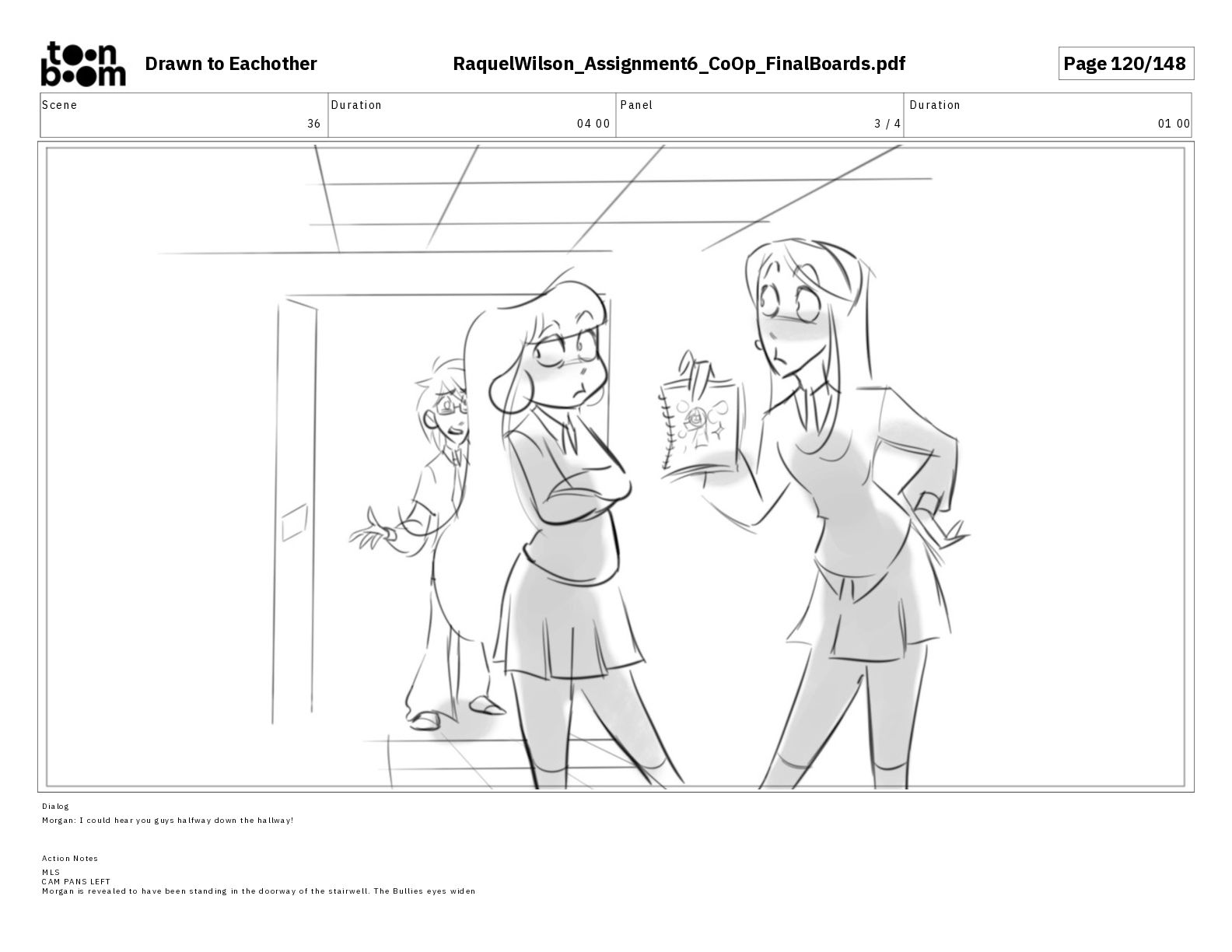 01 00 Dialog Morgan: I could hear you guys halfway down the hallway! Action Notes MLS CAM PANS LEFT Morgan is revealed to have been standing in the doorway of the stairwell. The Bullies eyes widen Drawn to Eachother RaquelWilson_Assignment6_CoOp_FinalBoards.pdf Page 120/148