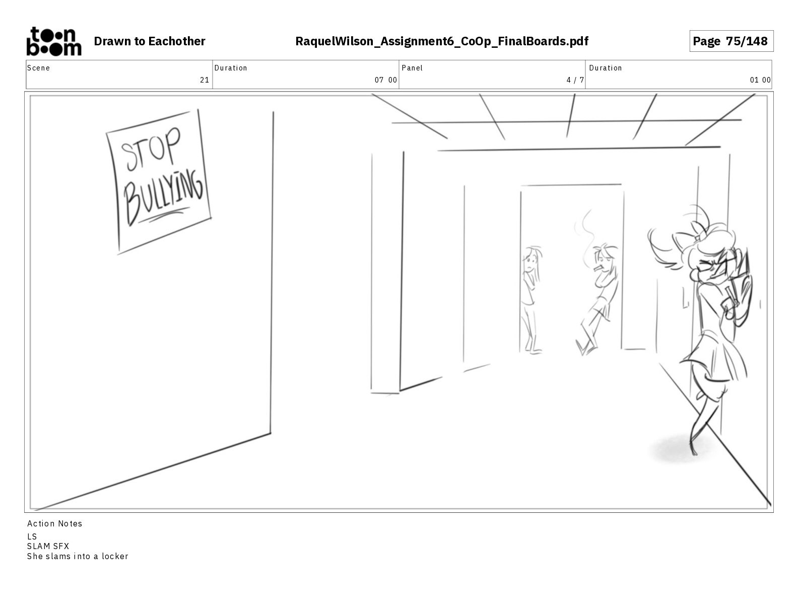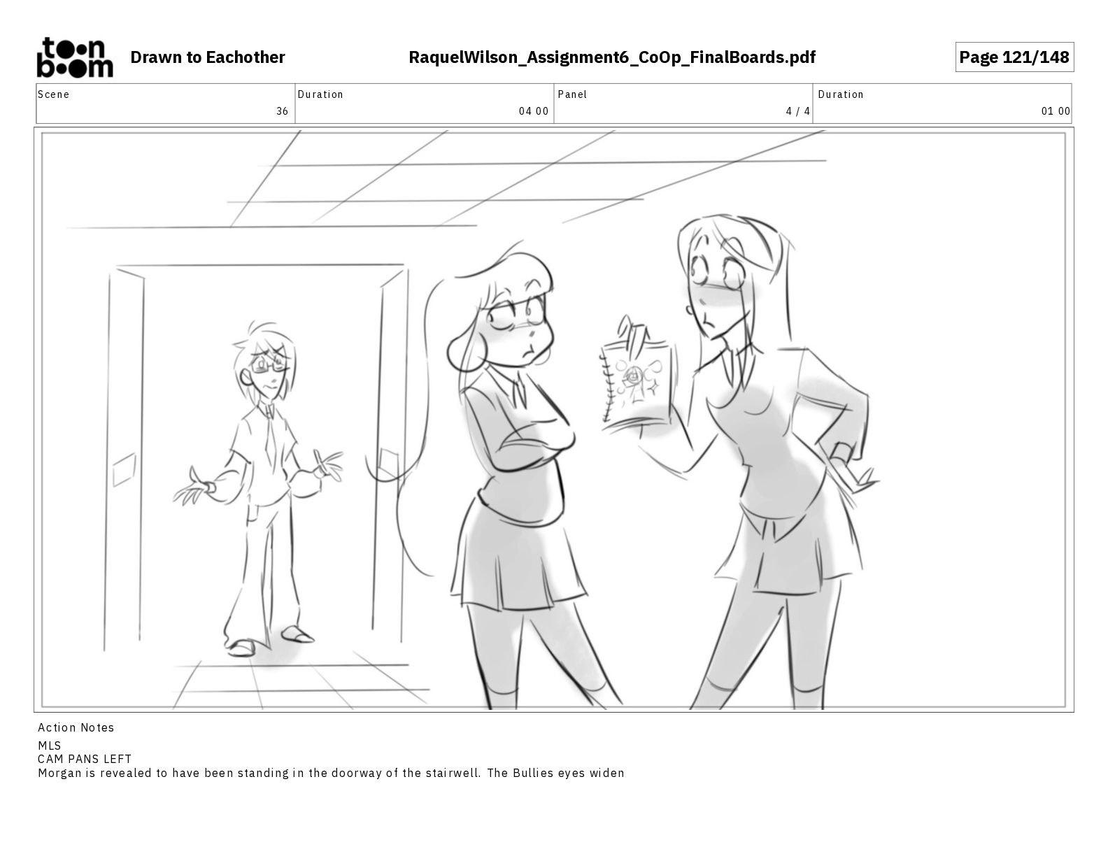 01 00 Action Notes MLS CAM PANS LEFT Morgan is revealed to have been standing in the doorway of the stairwell. The Bullies eyes widen Drawn to Eachother RaquelWilson_Assignment6_CoOp_FinalBoards.pdf Page 121/148