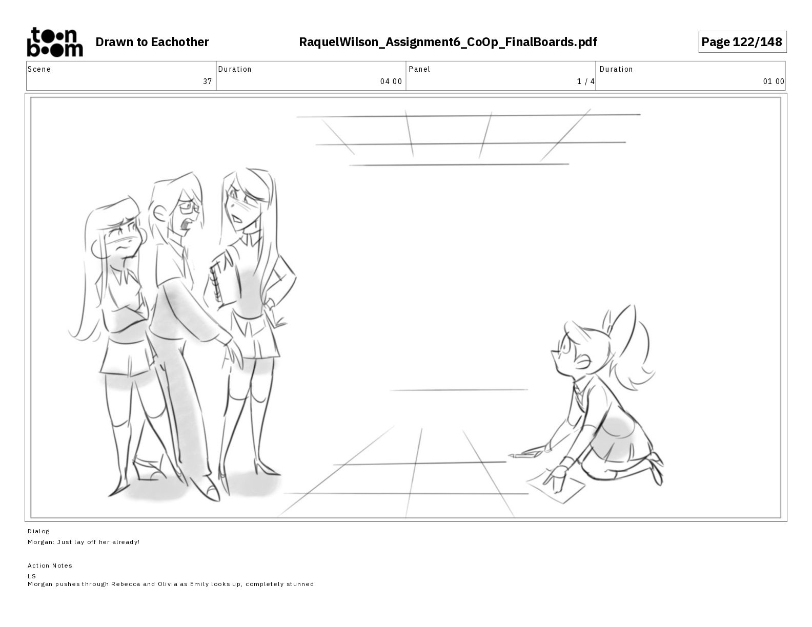 01 00 Dialog Morgan: Just lay off her already! Action Notes LS Morgan pushes through Rebecca and Olivia as Emily looks up, completely stunned Drawn to Eachother RaquelWilson_Assignment6_CoOp_FinalBoards.pdf Page 122/148