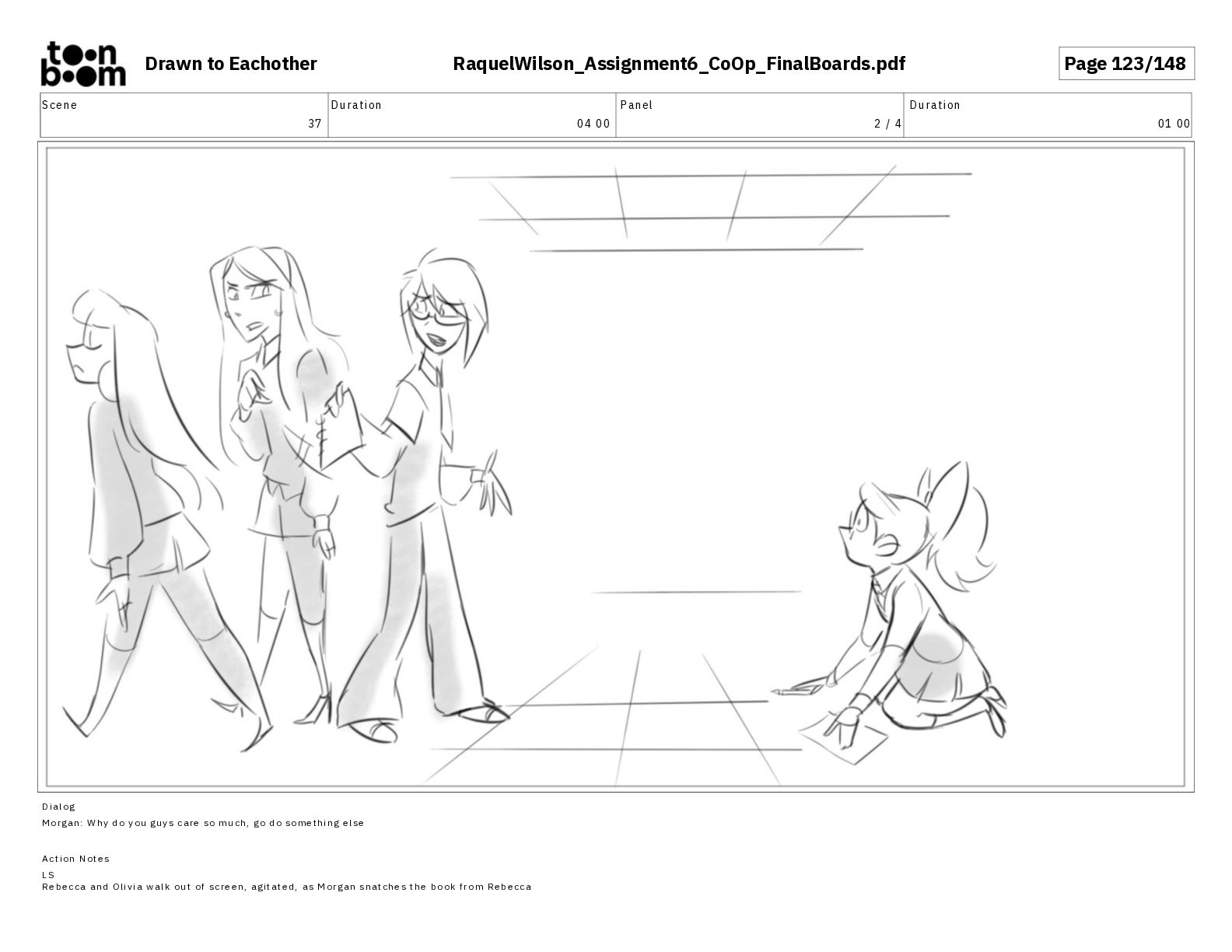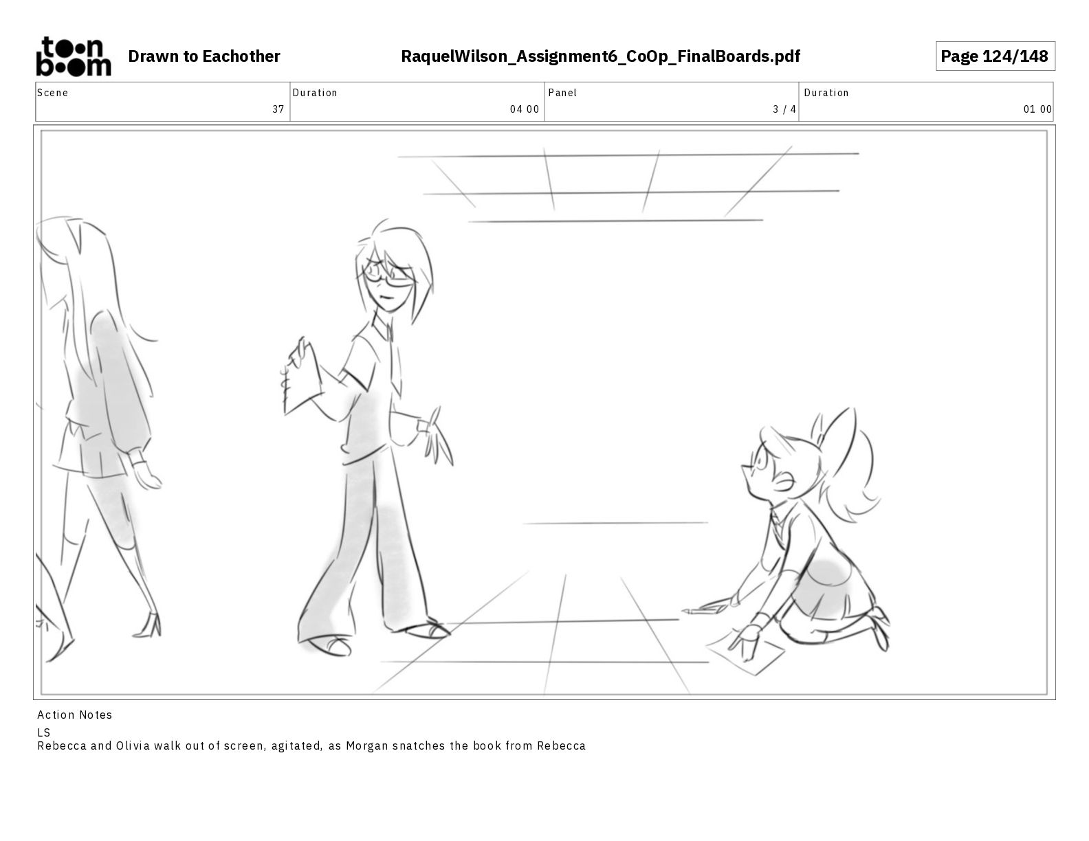 01 00 Action Notes LS Rebecca and Olivia walk out of screen, agitated, as Morgan snatches the book from Rebecca Drawn to Eachother RaquelWilson_Assignment6_CoOp_FinalBoards.pdf Page 124/148