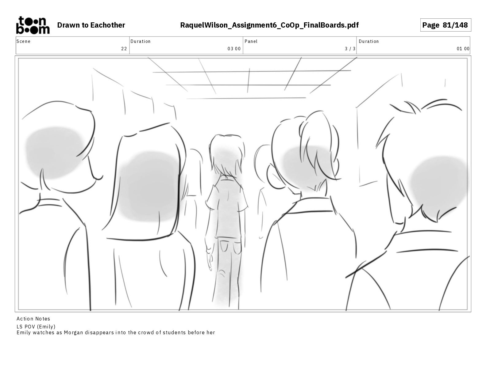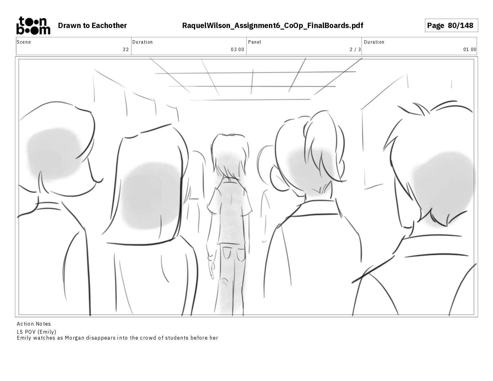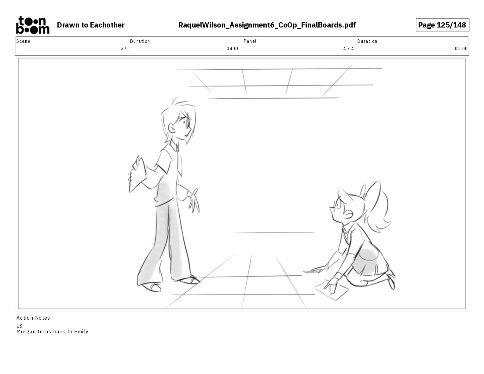 01 00 Action Notes LS Morgan turns back to Emily Drawn to Eachother RaquelWilson_Assignment6_CoOp_FinalBoards.pdf Page 125/148