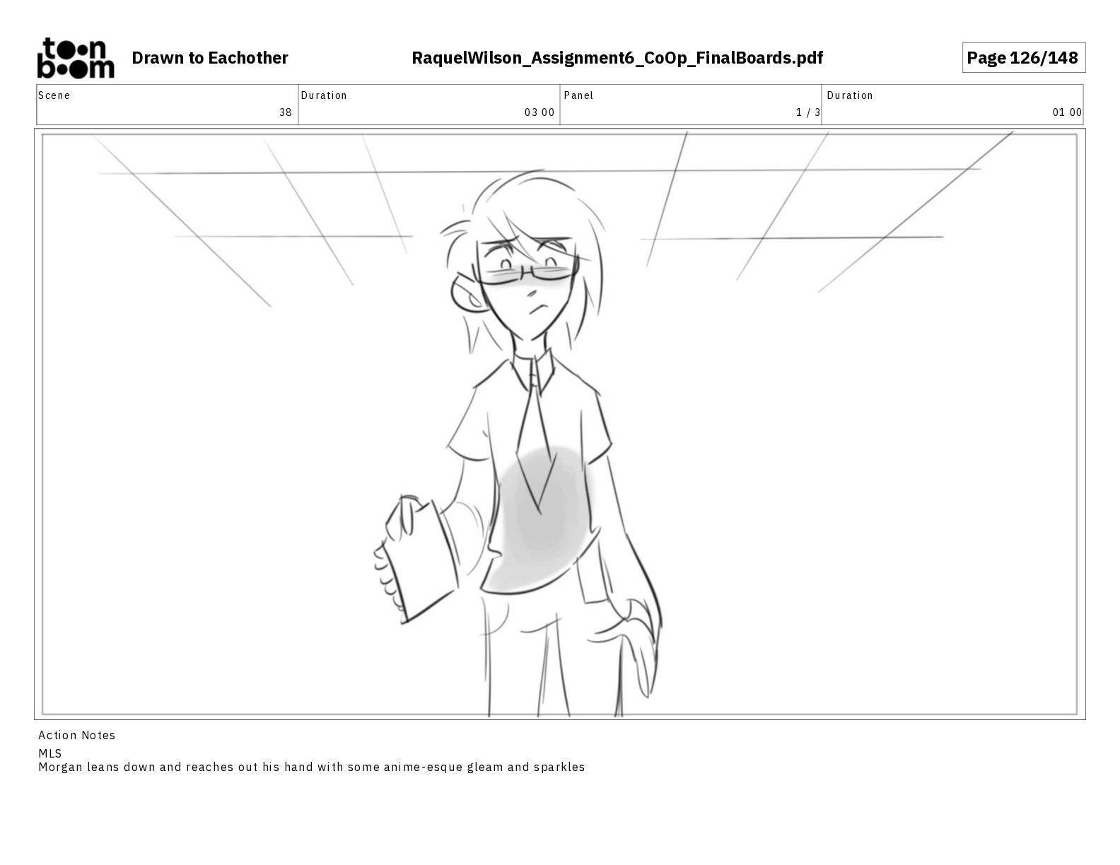01 00 Action Notes MLS Morgan leans down and reaches out his hand with some anime-esque gleam and sparkles Drawn to Eachother RaquelWilson_Assignment6_CoOp_FinalBoards.pdf Page 126/148