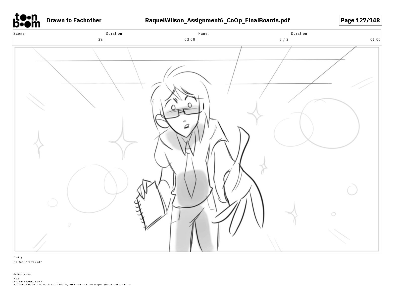 01 00 Dialog Morgan: Are you ok? Action Notes MLS ANIME SPARKLE SFX Morgan reaches out his hand to Emily, with some anime-esque gleam and sparkles Drawn to Eachother RaquelWilson_Assignment6_CoOp_FinalBoards.pdf Page 127/148