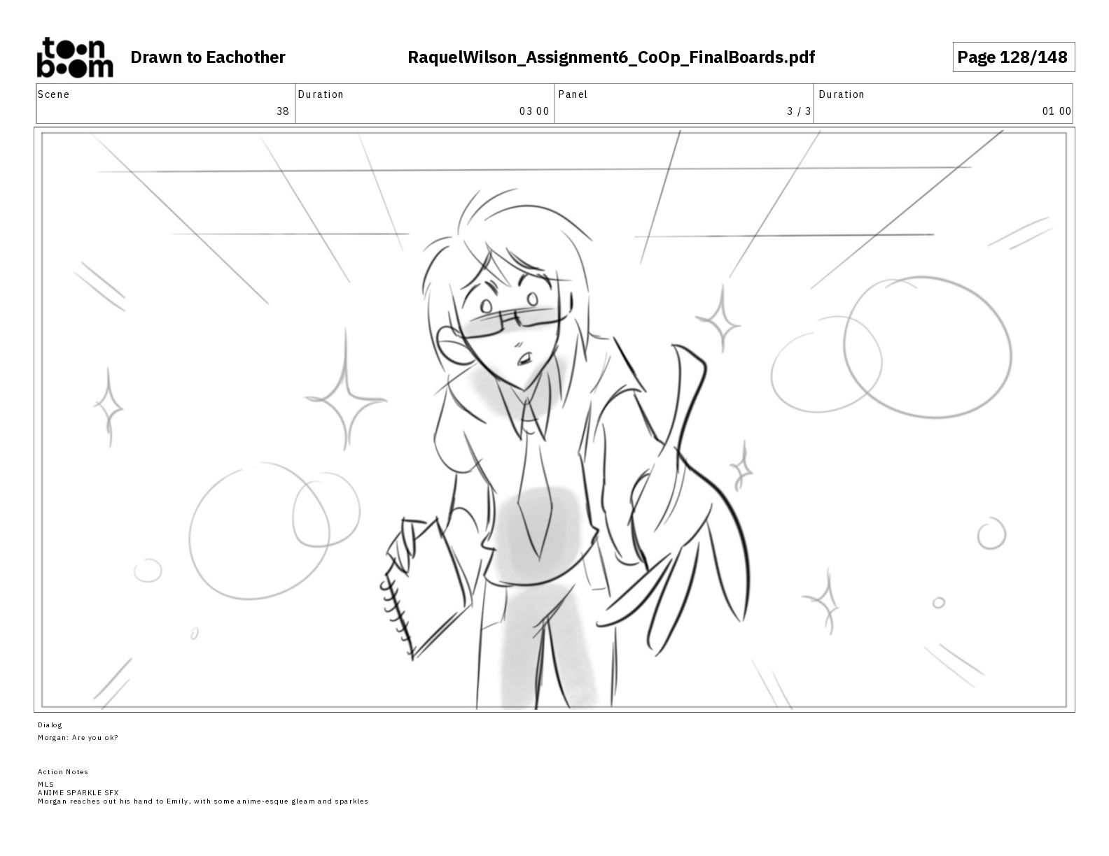 01 00 Dialog Morgan: Are you ok? Action Notes MLS ANIME SPARKLE SFX Morgan reaches out his hand to Emily, with some anime-esque gleam and sparkles Drawn to Eachother RaquelWilson_Assignment6_CoOp_FinalBoards.pdf Page 128/148