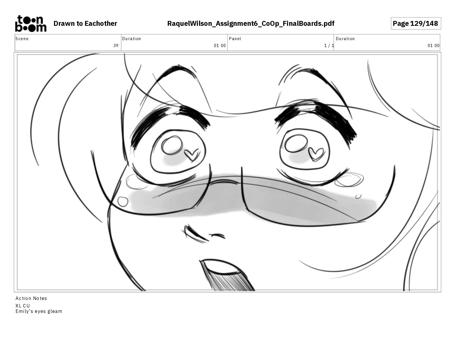 01 00 Action Notes XL CU Emily's eyes gleam Drawn to Eachother RaquelWilson_Assignment6_CoOp_FinalBoards.pdf Page 129/148