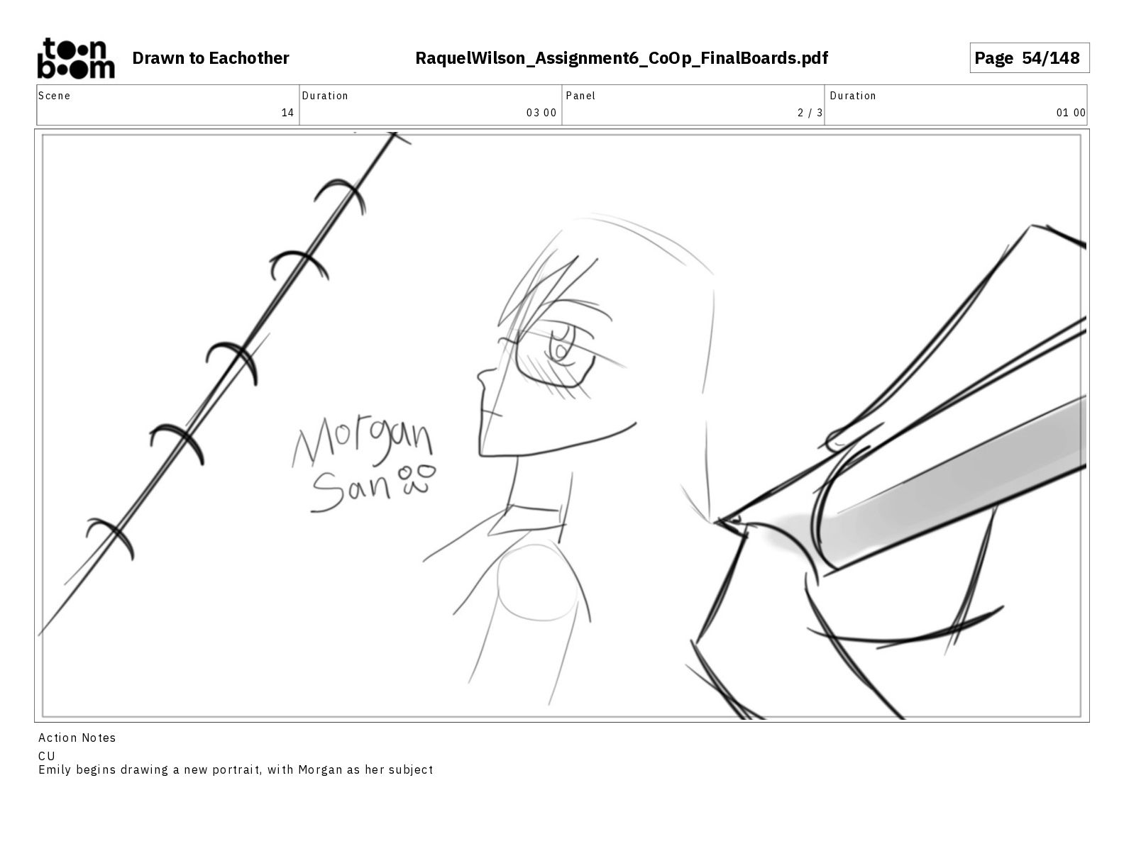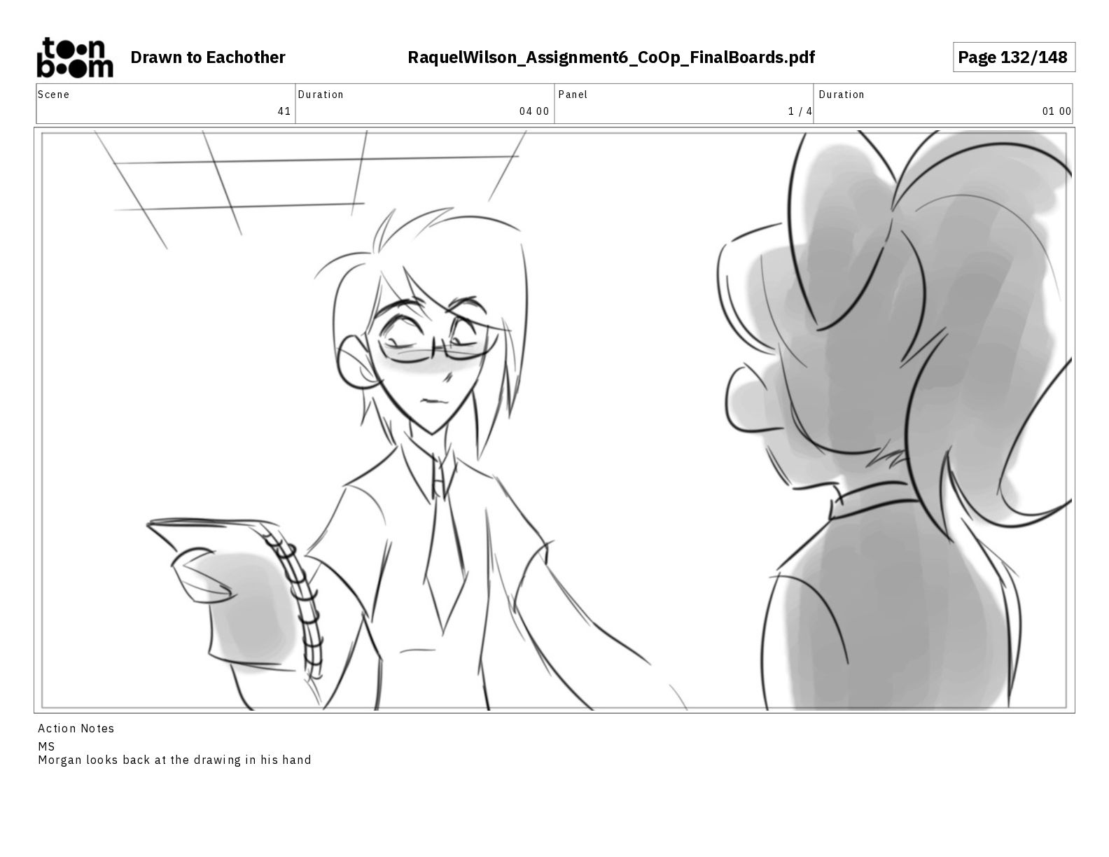 01 00 Action Notes MS Morgan looks back at the drawing in his hand Drawn to Eachother RaquelWilson_Assignment6_CoOp_FinalBoards.pdf Page 132/148