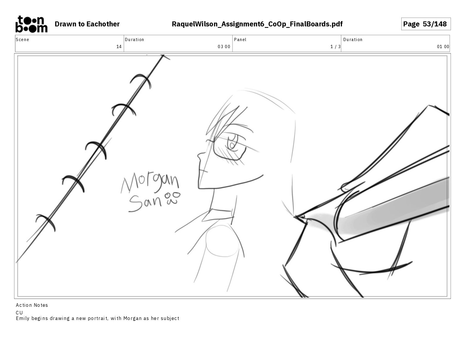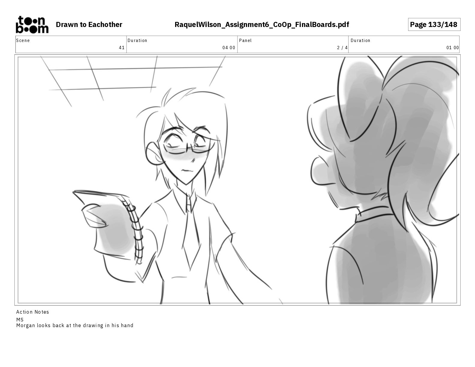 01 00 Action Notes MS Morgan looks back at the drawing in his hand Drawn to Eachother RaquelWilson_Assignment6_CoOp_FinalBoards.pdf Page 133/148
