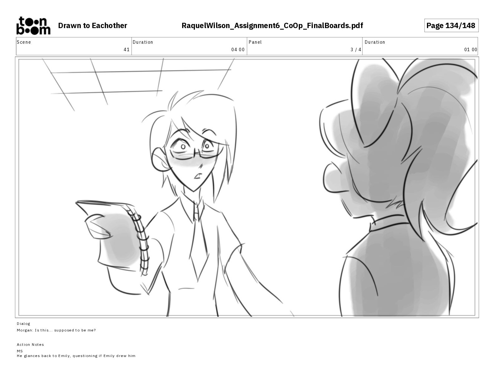 01 00 Dialog Morgan: Is this... supposed to be me? Action Notes MS He glances back to Emily, questioning if Emily drew him Drawn to Eachother RaquelWilson_Assignment6_CoOp_FinalBoards.pdf Page 134/148