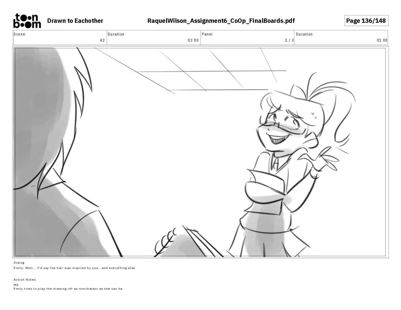 01 00 Action Notes MS Emily tries to play the drawing off as nonchalant as she can be Dialog Emily: Well... I'd say the hair was inspired by you...and everything else Drawn to Eachother RaquelWilson_Assignment6_CoOp_FinalBoards.pdf Page 136/148