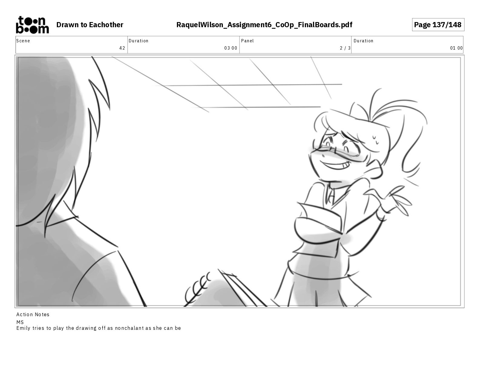 01 00 Action Notes MS Emily tries to play the drawing off as nonchalant as she can be Drawn to Eachother RaquelWilson_Assignment6_CoOp_FinalBoards.pdf Page 137/148