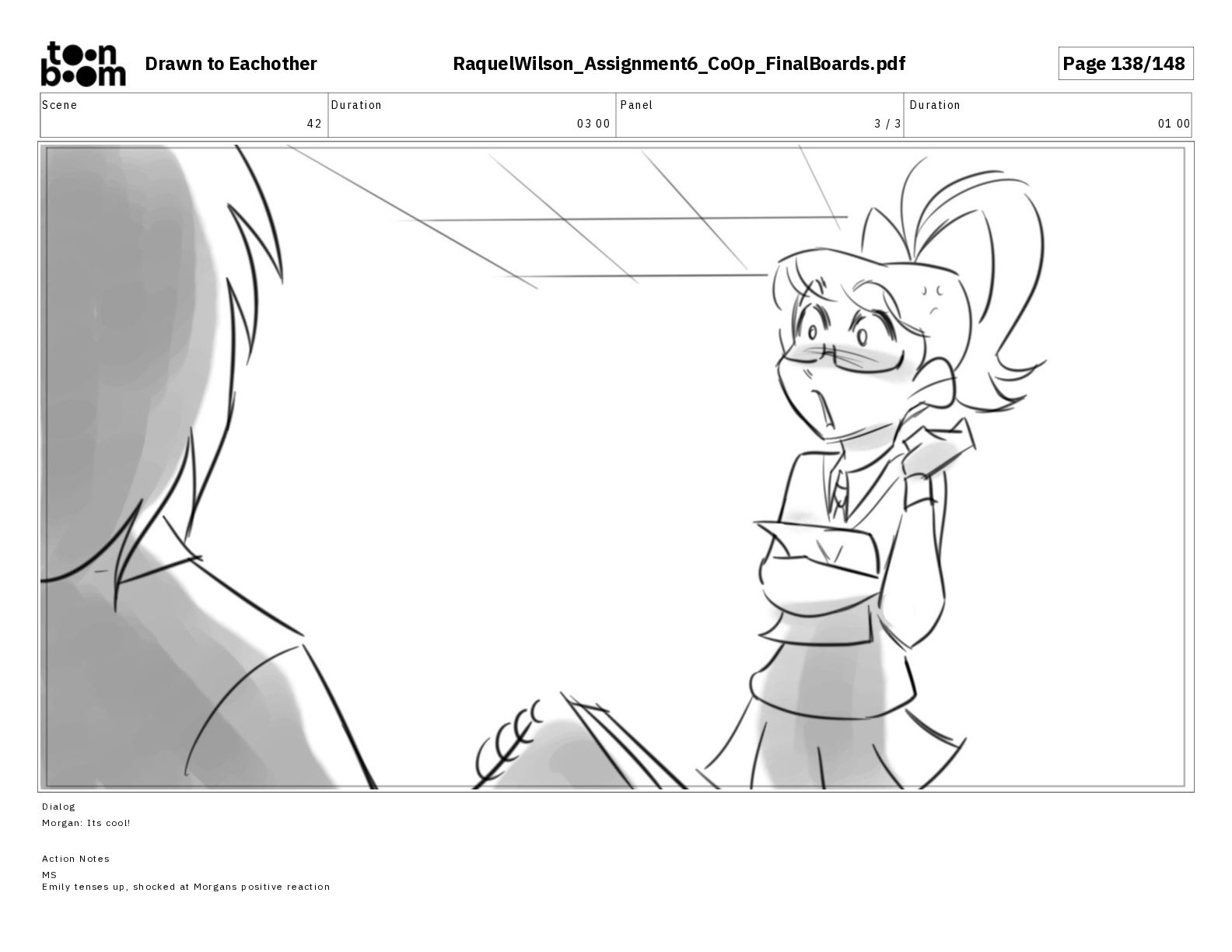 01 00 Dialog Morgan: Its cool! Action Notes MS Emily tenses up, shocked at Morgans positive reaction Drawn to Eachother RaquelWilson_Assignment6_CoOp_FinalBoards.pdf Page 138/148