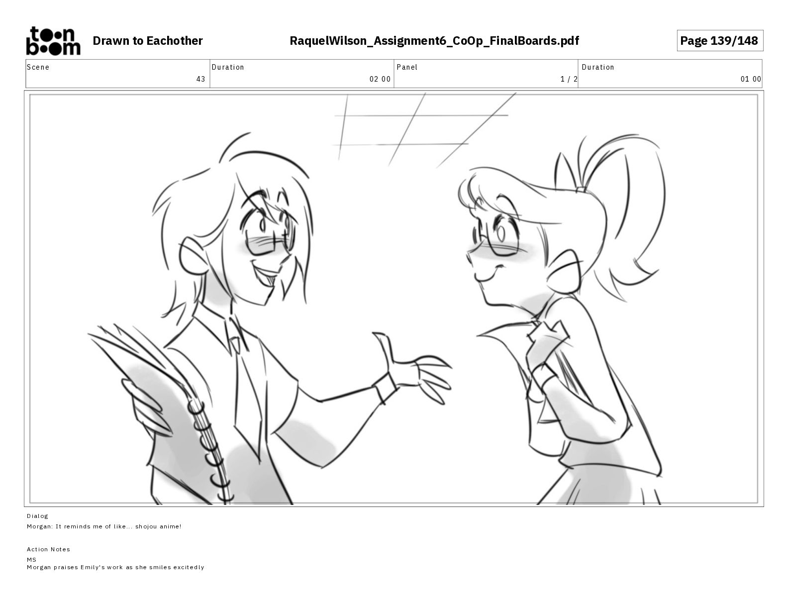 01 00 Dialog Morgan: It reminds me of like... shojou anime! Action Notes MS Morgan praises Emily's work as she smiles excitedly Drawn to Eachother RaquelWilson_Assignment6_CoOp_FinalBoards.pdf Page 139/148