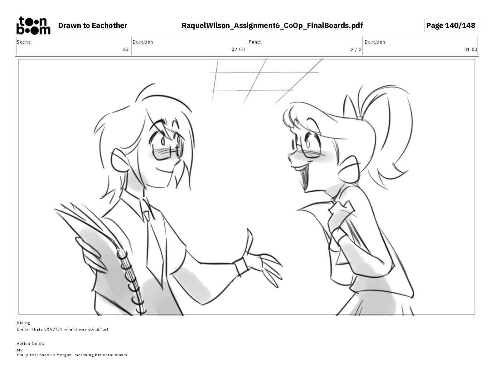 01 00 Dialog Emily: Thats EXACTLY what I was going for! Action Notes MS Emily responds to Morgan, matching his enthusiasm Drawn to Eachother RaquelWilson_Assignment6_CoOp_FinalBoards.pdf Page 140/148