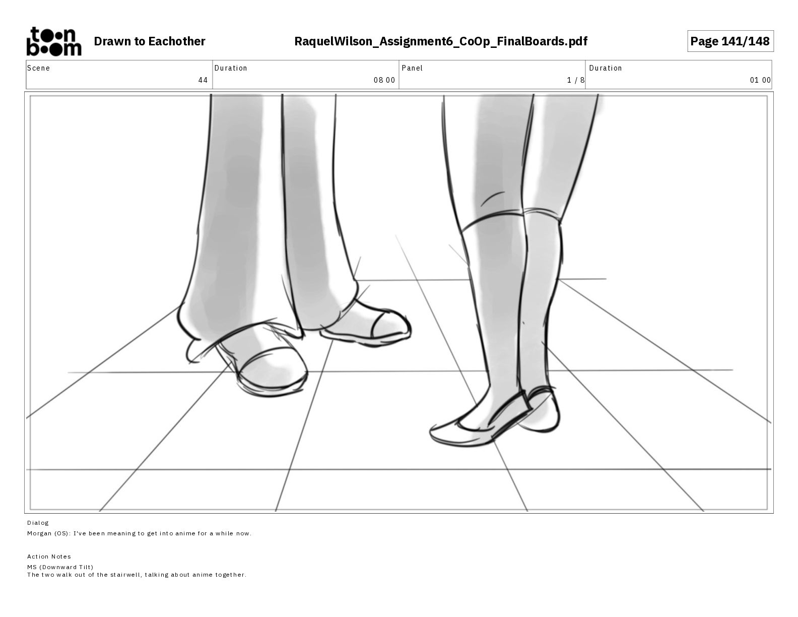 01 00 Action Notes MS (Downward Tilt) The two walk out of the stairwell, talking about anime together. Dialog Morgan (OS): I've been meaning to get into anime for a while now. Drawn to Eachother RaquelWilson_Assignment6_CoOp_FinalBoards.pdf Page 141/148