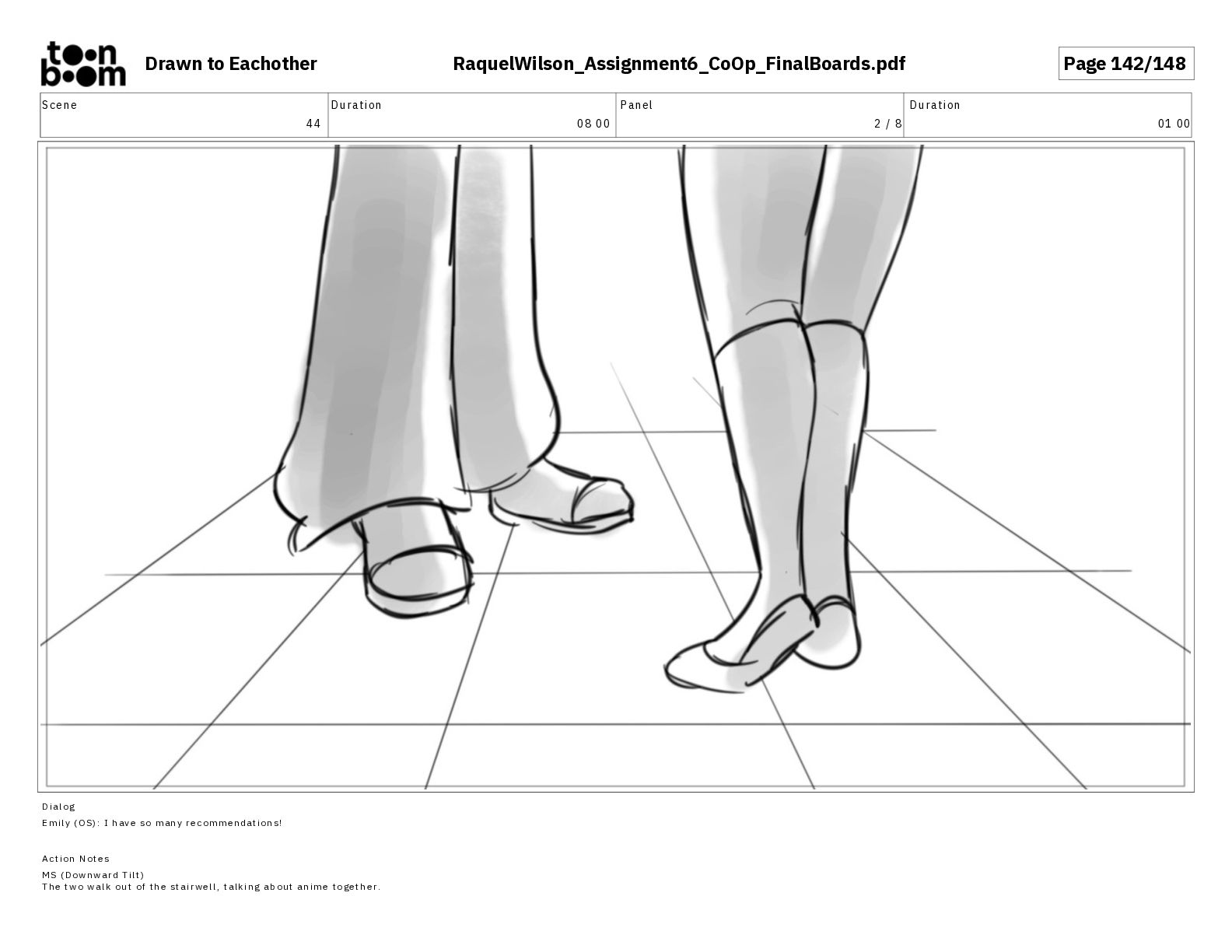 01 00 Dialog Emily (OS): I have so many recommendations! Action Notes MS (Downward Tilt) The two walk out of the stairwell, talking about anime together. Drawn to Eachother RaquelWilson_Assignment6_CoOp_FinalBoards.pdf Page 142/148